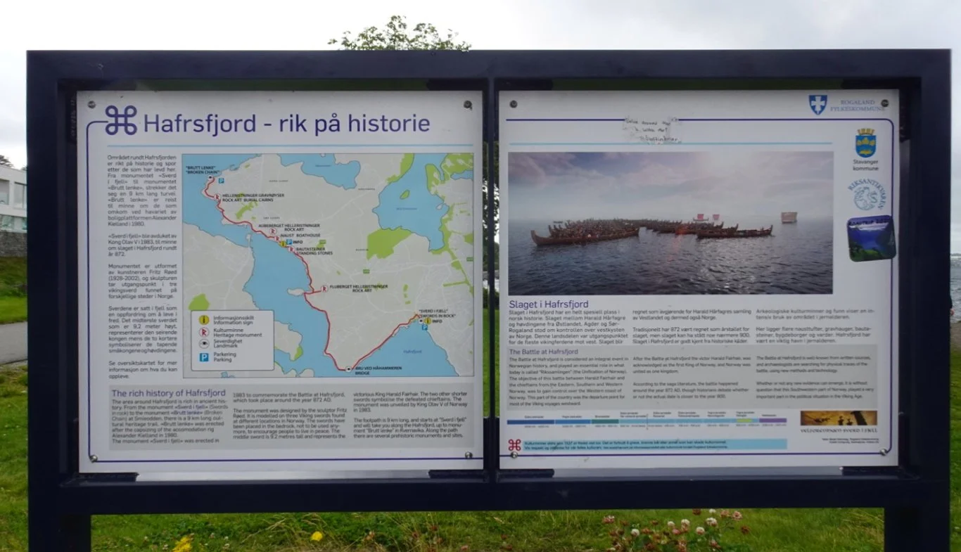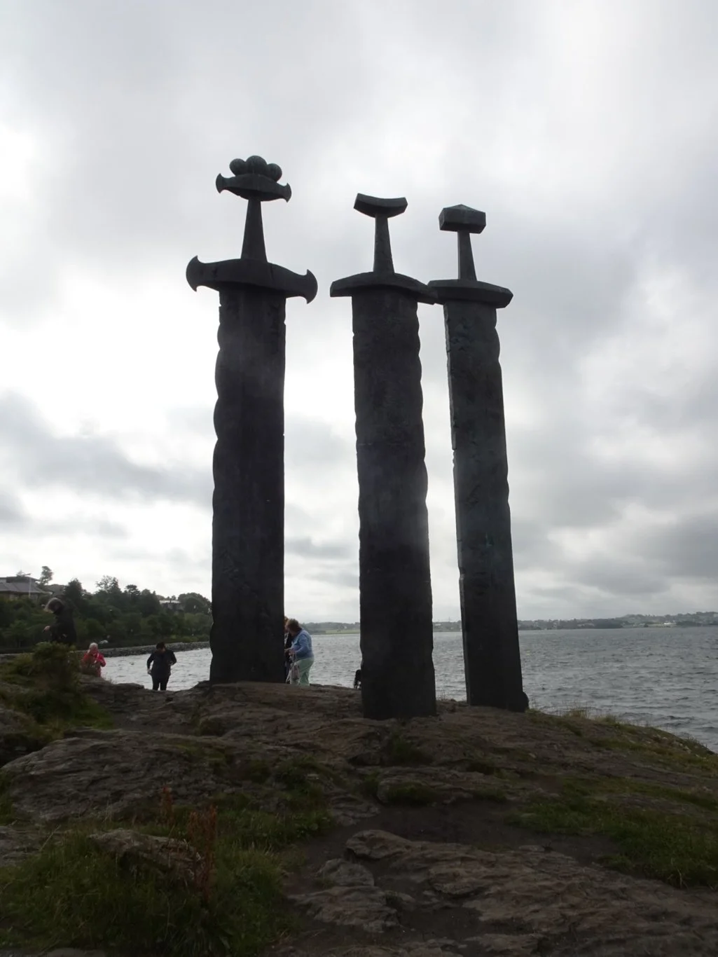 Our first stop, on the shores of Hafrsfjord - which Nicholas explained was the sea and not a lake - was an important site in Norway’s history. Here, in 872, the Viking Harald FairHair fought a battle to impress the love of his life, Ragenhild daughter of the King of Denmark. To win her hand, he conquered twenty or more minor kings over a period of ten years, finally becoming the first King of all Norway at the Battle of Hafrsfjord right here. The place is marked by three huge bronze swords, driven into the ground to emphasise the peace that followed.