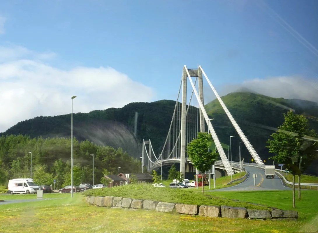 Here, the landmark was the high road bridge, which soared into the air allowing space beneath it for shipping to pass into the fjord below. It was utterly spectacular and the significant landmark of the route.