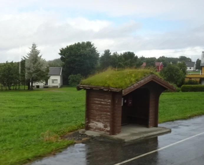 Along the way, we were enjoying seeing aspects of life around here that are rather different from those at home. These little bus stops for example. Our village and those around it are known for quirky bus stops, but none of them have grass roofs and certainly none of them have collections of post boxes inside them.