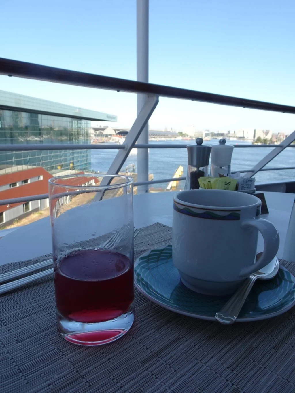 For the first time this cruise, we were able to sit out on the deck and I could enjoy my Birchermuesli, cranberry juice, croissant and coffee sitting in my favourite place!