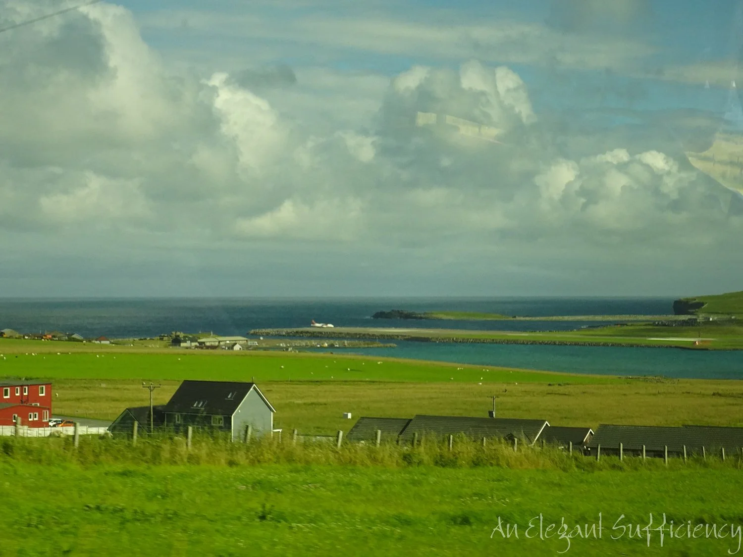 We were just a small group of six today, with John the driver and Drew our guide. From the minute we set off, Drew talked about the islands, the harbour and the deepwater jetties. He told us about the population of Shetland which remains just about the same as years ago, about the small settlements we passed and about the crofts we were passing.