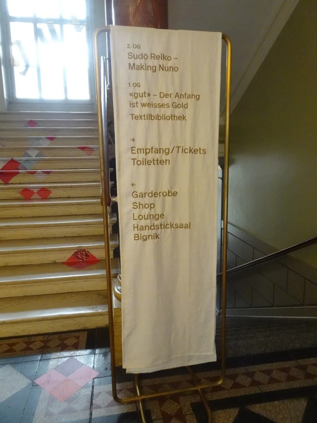So many small details make this museum special. Not only are the tickets still printed on fabric but wherever possible, the signs are embroidered too. Today, the stairs were adorned with pieces of patchwork representing the second exhibition currently running about St Gallen’s history of linen production.