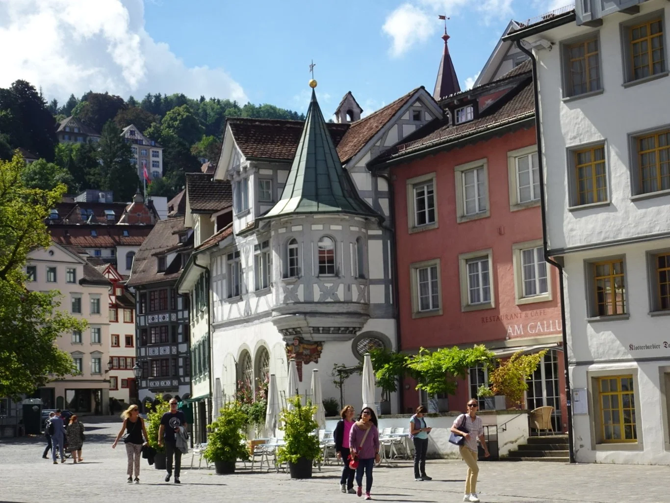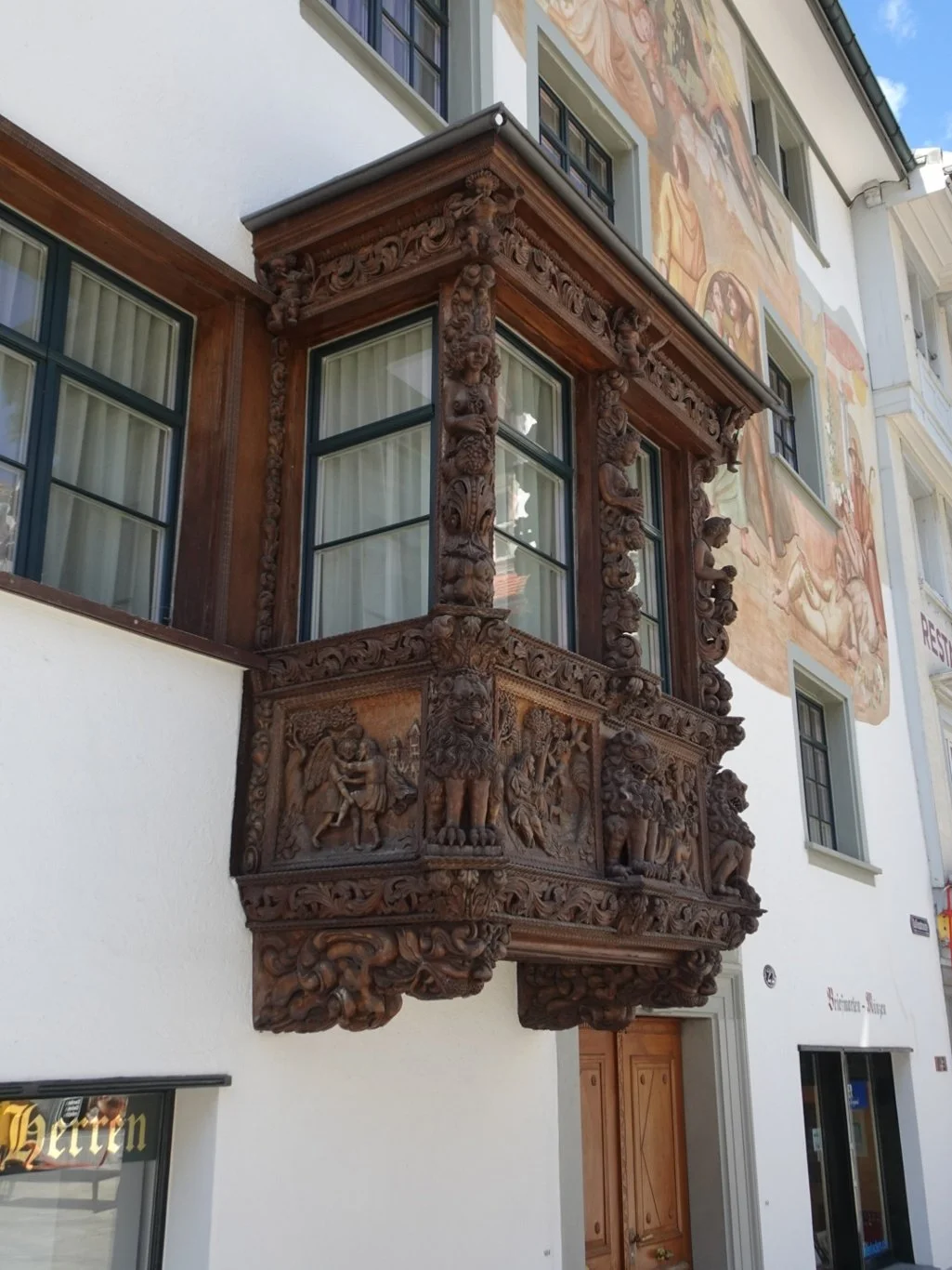 St Gallen is noted for its oriel windows and a fine example was right there opposite from where we were sitting. It’s an old favourite and I have no idea how many photographs I have of that very window, but I can’t resist taking another.