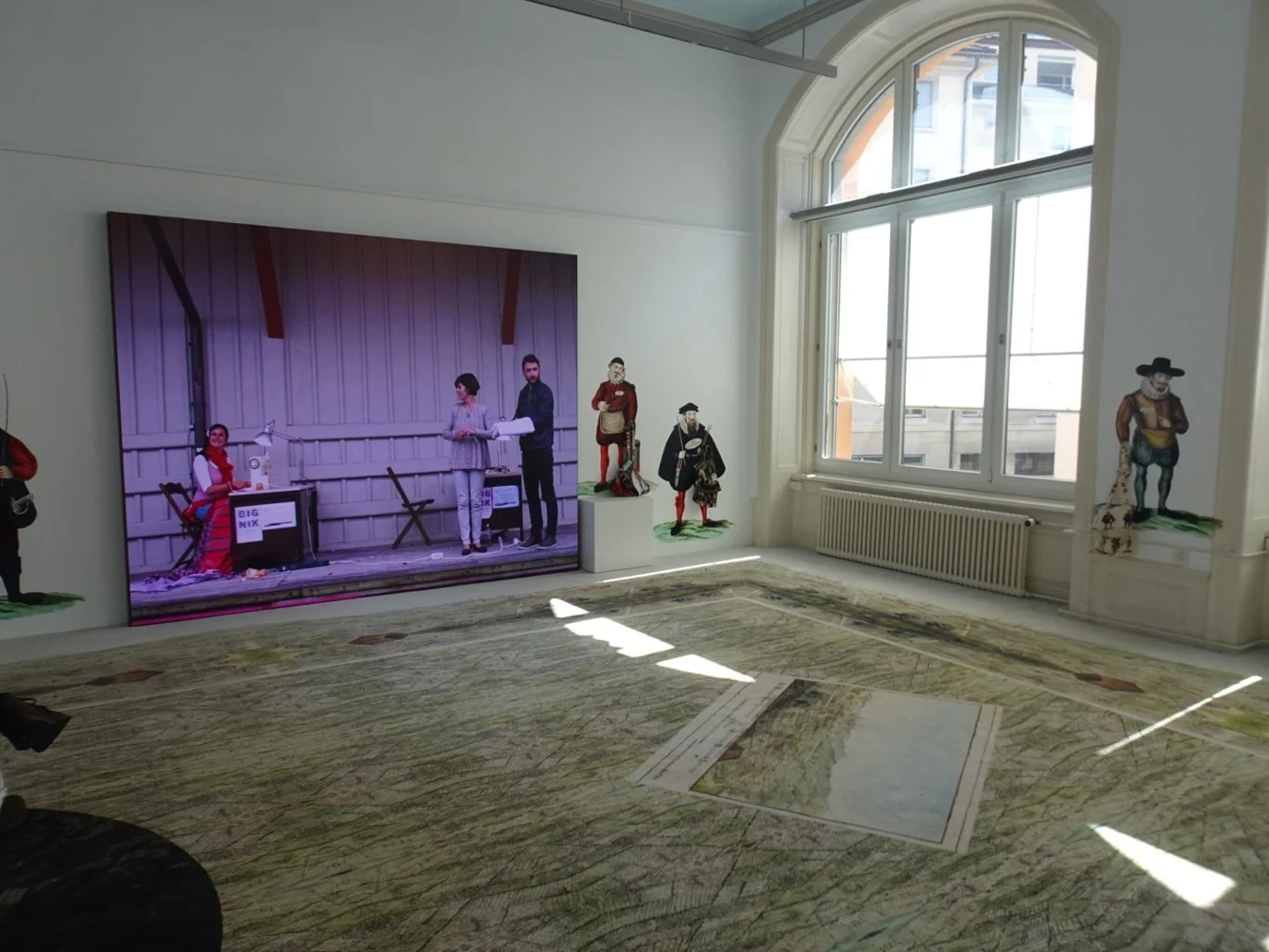 I would have been quite satisfied to have left it there, but there was more to see. Down one floor and we were standing on a beautifully made “carpet”, printed with the images of old St Gallen. The room showed the variety of people associated with linen production in the past, described each of them and depicted them with a handmade shoulder bag hanging beside them with an illustration of their skill. Clever design. Actually, the story here was also of the celebration held each year: the “Bignik” when residents are invited to create a patchwork contribution to a giant installation. Now we understood the relevance of the squares on the stairs we’d seen earlier.