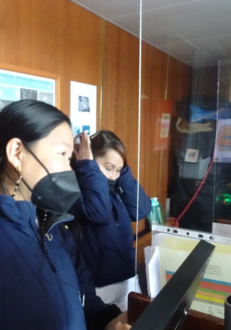 We giggled with Rhea, a member of the security staff who checks us in and out of the ship each day. She held her hands over her ears this morning…why?