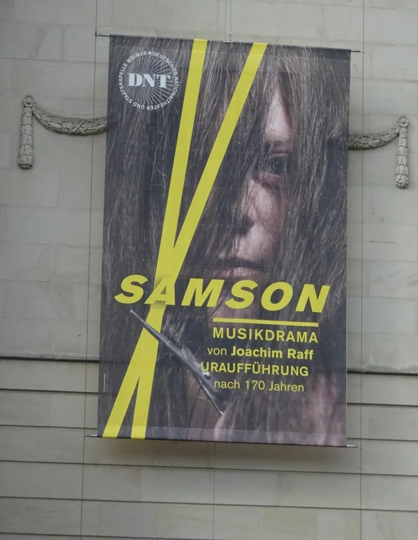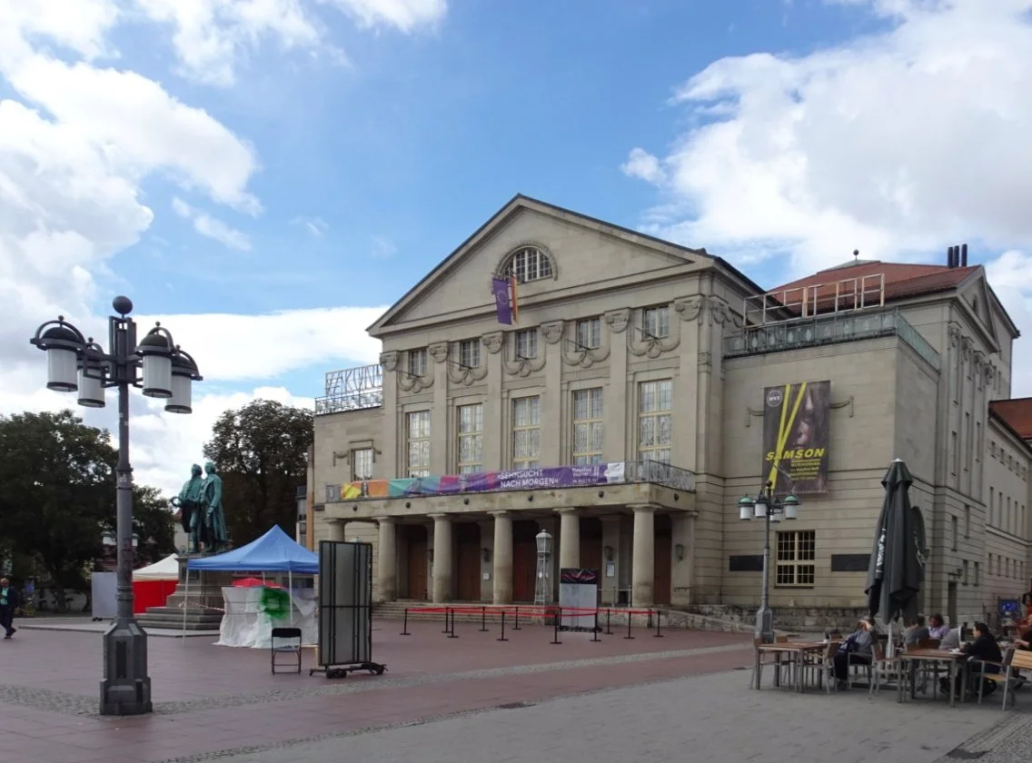 Our first stop was the National Theatre where the opera Samson will be premiered tomorrow evening. It’s a rather important location in German history and I remembered the figures of Goethe and Schiller there on the plinth in front of it. We took a quick selfie to WhatsApp to our friend Bernd in München but did so hurriedly because there were so many people wanting to do the same!