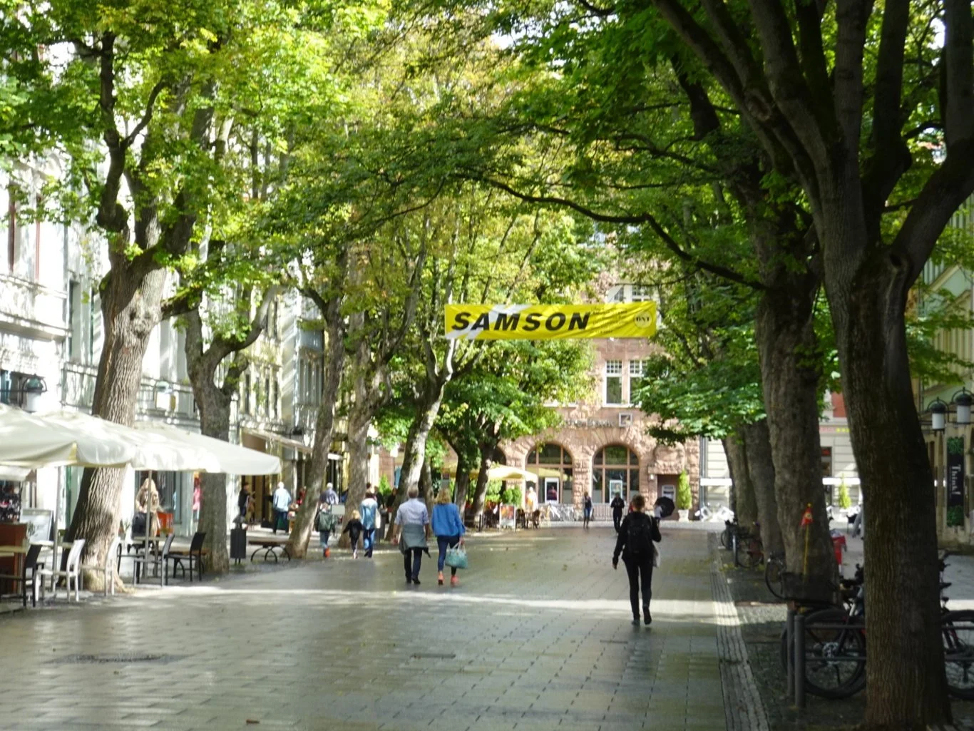 We dipped in and out of shops, into the DM drugstore for one or two favourite bits and pieces and both a lovely old bookshop and a better stocked and more comfortable new one. We also admired the banner hanging in the trees!