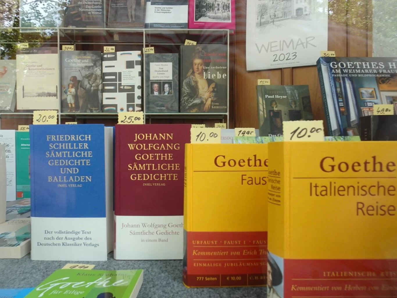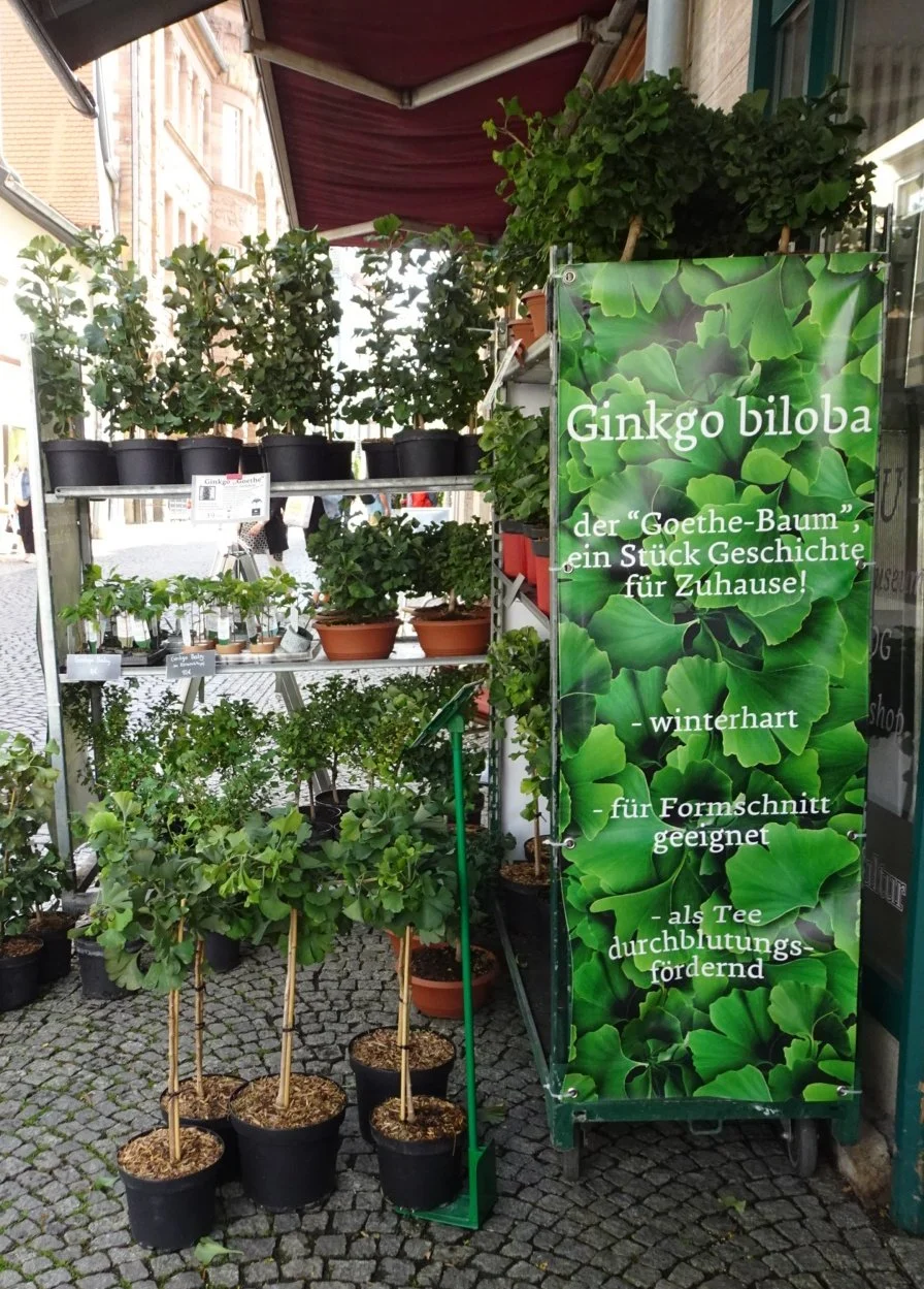 As we returned to our hotel, I spotted something. The Ginkgo shop. I had quite forgotten this “thing” about ginkgo here but soon remembered seeing that distinctive leaf shape all over the place. Why? It seems as though Goethe sent a leaf to a lady along with a poem, though since he didn’t appear to be in Weimar at the time and the leaf seems to have come from Heidelberg, it seems like a very odd association. But with all the Goethe stuff here, any excuse, eh?