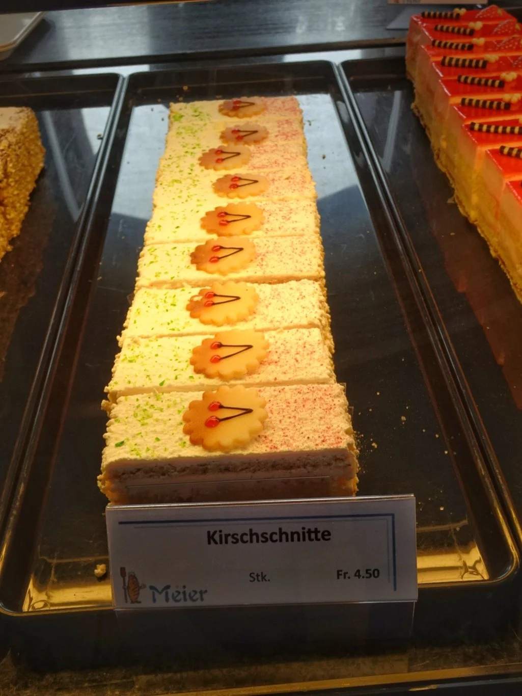 As we were being served, we noticed the Kirschscnitte right there in front of us and still feeling bereft of our favourite Zuger Kirschtorte, we soon had dessert organised as well.