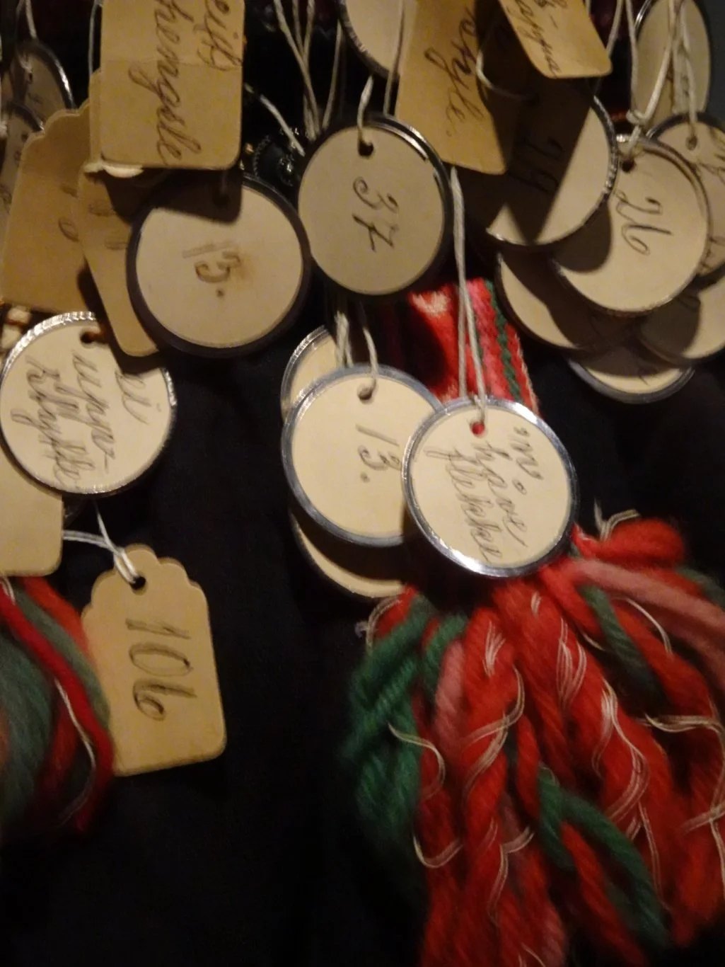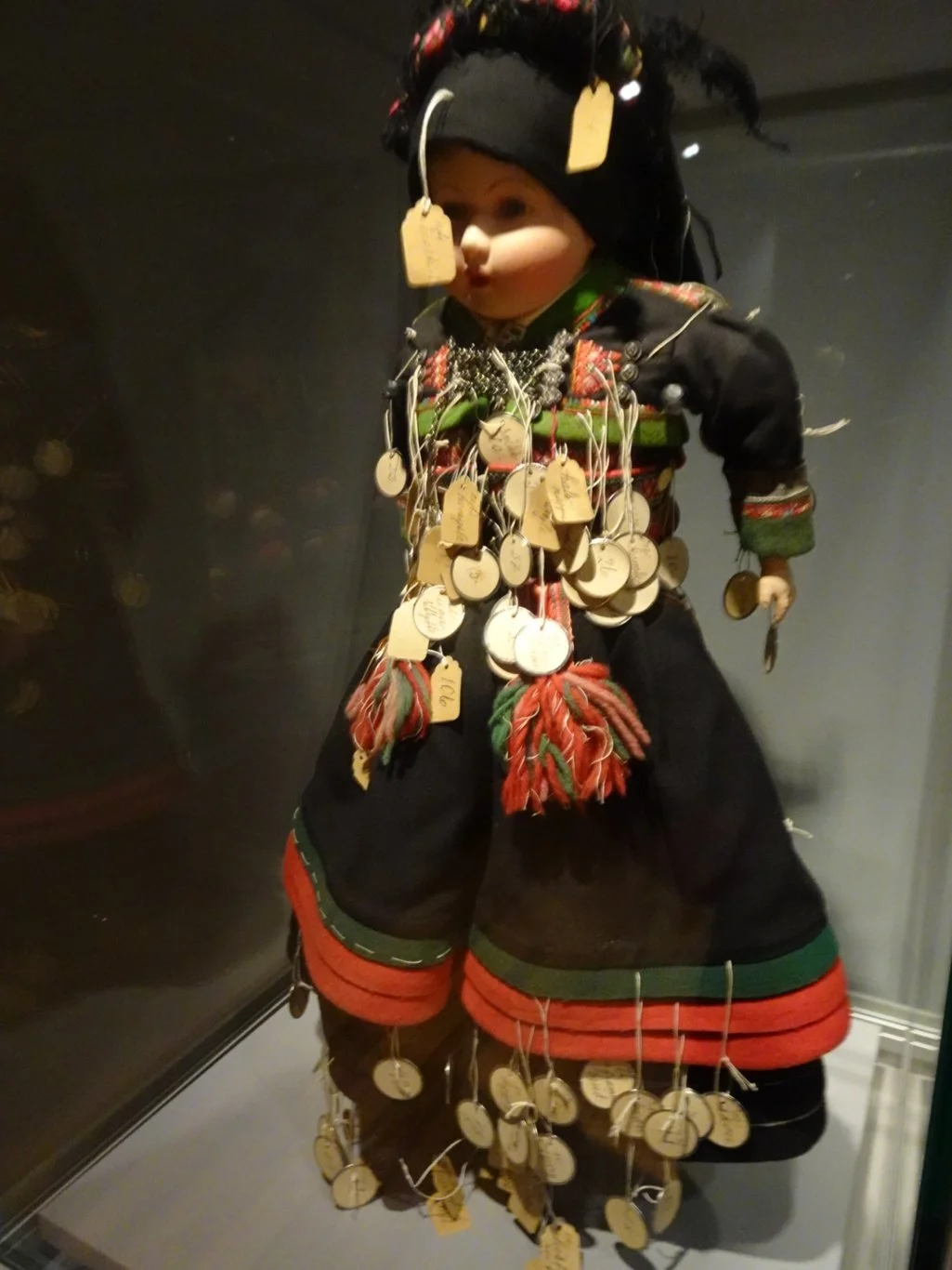 I took so many photographs in these folk art galleries, one or two of which stand out as being particularly interesting. This little doll, for example. I spotted all the labels fixed to her clothing and peered at them to see if I could read them.
