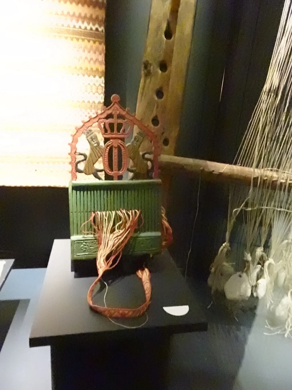 There were also some interesting looms, though at first I failed to see any narrow braiding, even in the Sami collection. But there, in a dark corner I spotted a small decorative heddle similar in design to a far simpler one I have at home bought from Stoorstalka in the far North of Sweden. Knowing I couldn't use a flash in this textile gallery, I fiddled with my camera settings for a while and crossed my fingers - it worked!