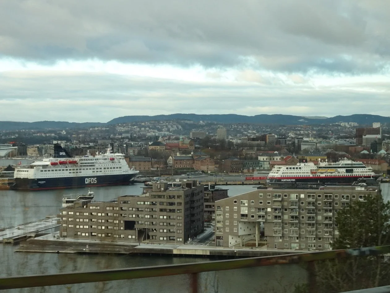 Our thoughts of visiting the ski jump at Holmenkollen were abandoned before we'd even started as the museum is undergoing renovation and reopens next weekend. Quickly revising our plans with an alternative viewpoint, we came up with the idea of Ekebergpark which not only offered views of the city but had a collection of outdoor sculpture too. Were we sculpted out yet? Of course not! And anyway, we recalled watching the little blue trams climbing the hill opposite our ship's berth last Summer and it was fun to think we might ride that same tram now we are back.