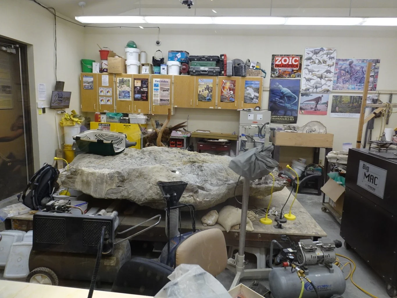 Paleontologists were working in the lab and could be seen through the winow as they chipped stone away from an enormous fossil.