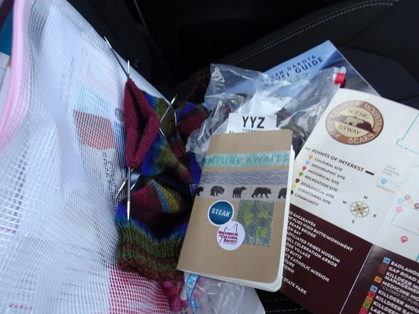 I had my road trip kit alongside in the empty seat. Notebook and pencil, map, knitting, journal kit and almost out of sight, a bag of Good and Plenty Liquorice comfits ;-) During stretches like these, the socks progress a little and I can catch up with a scribble or two in my notes.