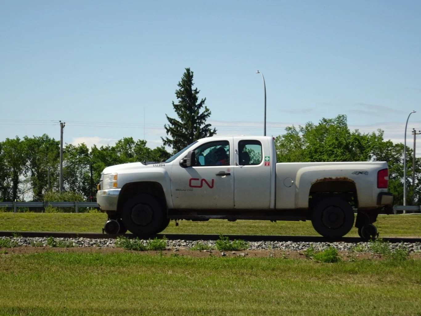 Our road trips frequently include the weird and wonderful and as we’ve driven along railway lines during the last two weeks, we’ve noticed that occasionally, a road vehicle appears to be driving along the rails. This morning, as we turned off the Trans Canada Highway, we noticed one coming towards us, so I grabbed my camera. Curious, n’est-ce pas?! (As long as there isn’t a train coming!)