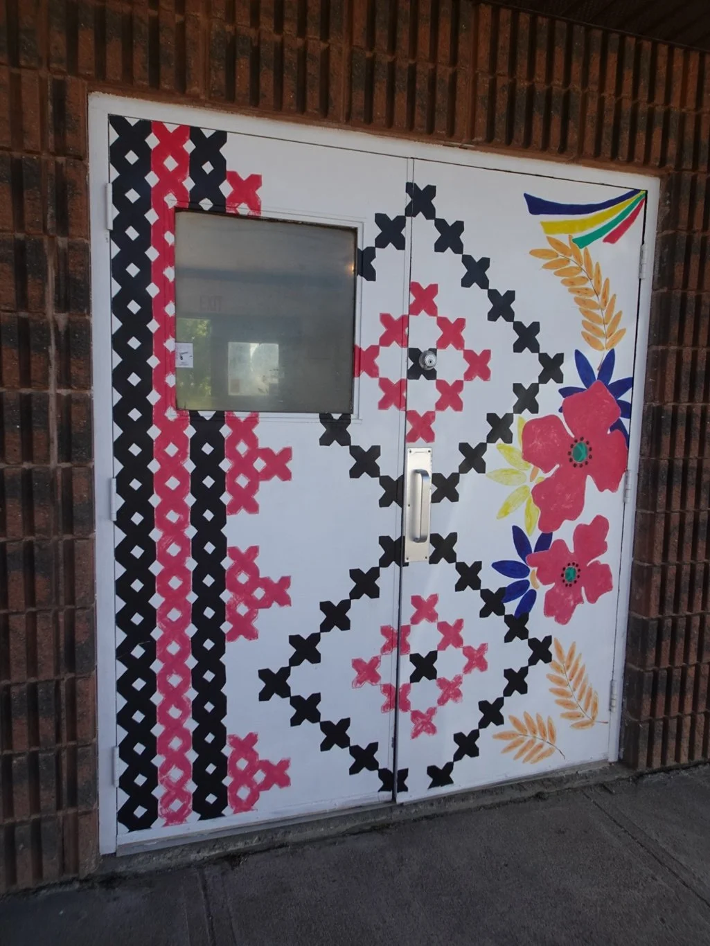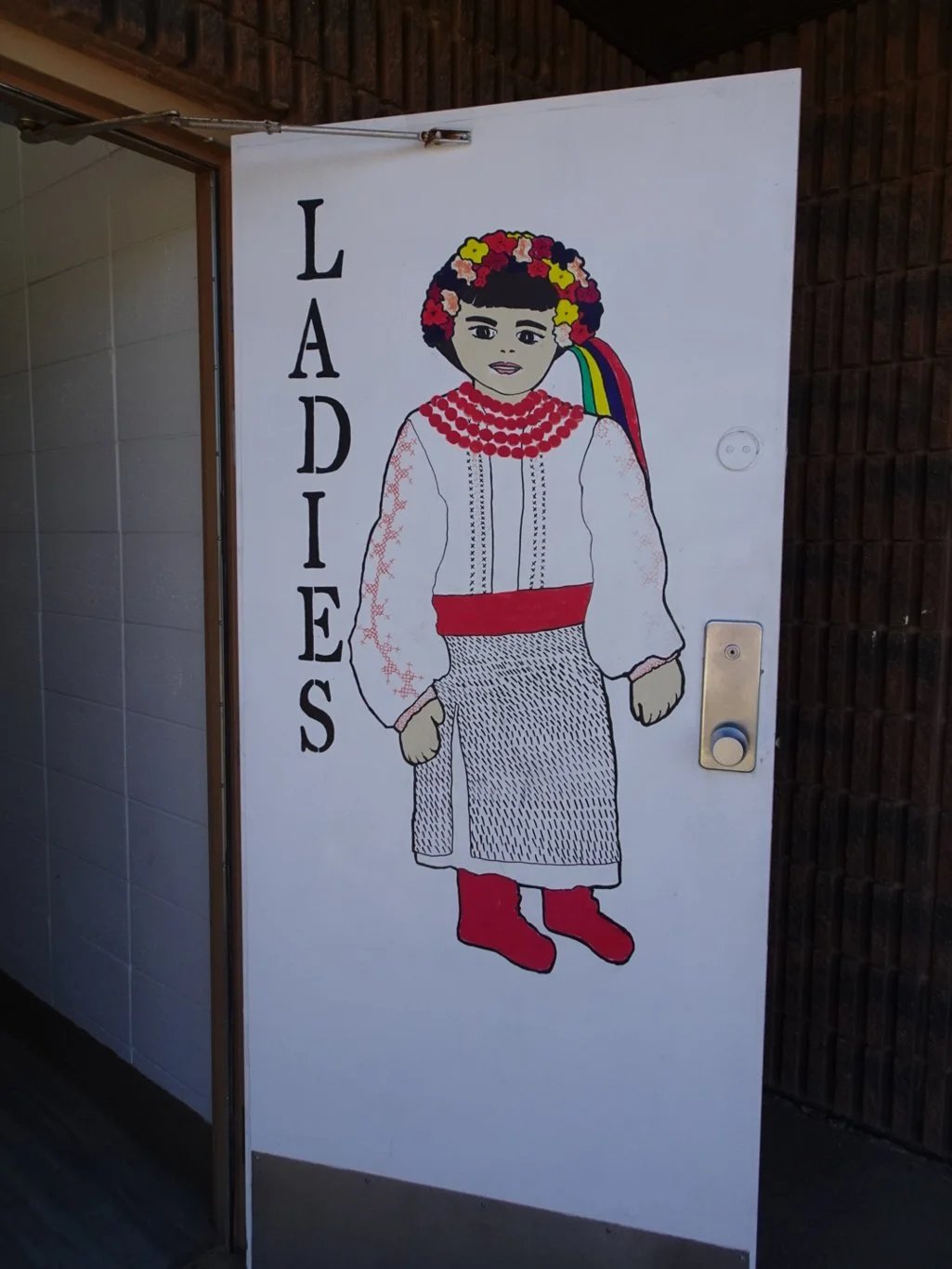 We had left the highway at Vegreville, where there’s a large Ukrainian community. The doors to the Tourist Office had been painted to reflect that, as was the door to the Ladies loo.