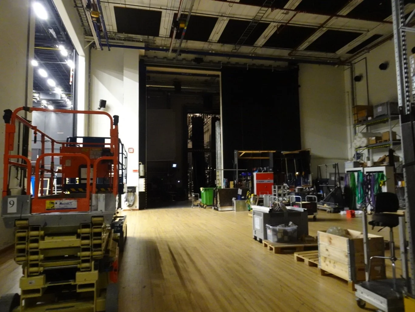 Lastlly, it was through and around and onto the main stage from where the audience seemed surprisingly close. We noted the tower high above us which we’d seen earlier from the ship - those vast backdrops can be hauled right up there but at the moment, it was the dance floor which hovered above us in four pieces. Just as we’d seen in the other theatre, the stage here was flexible and could be extended, raised or lowered, as could the orchestra pit, if needed. Actually, on this occasion, we were standing on what would become the orchestra pit because it had been raised whilst work was going on.