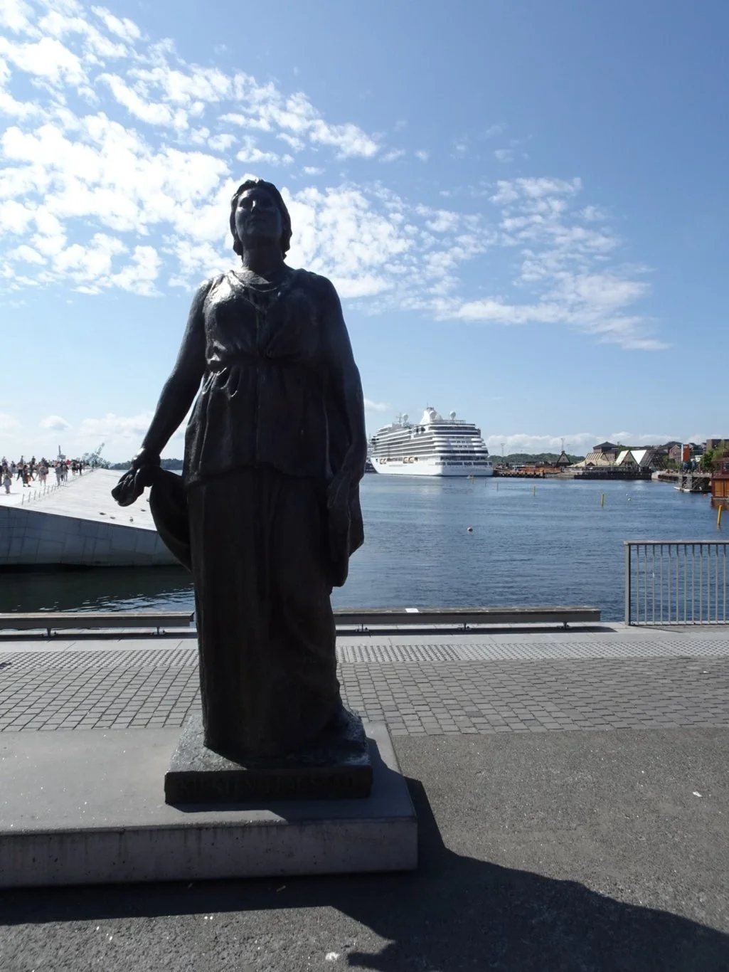 As we went, I spotted a bronze figure very similar to many others we’ve seen overlooking harbours in Norway. “I’ll just nip over and take a picture of the fisherwoman over there” I said to my Hero. But oh dear…it’s a good job the figure couldn’t hear my words, for this was no fisherwoman but Kirsten Flagstad, Norway’s most beloved opera star! I whispered an apology in case anyone had heard!