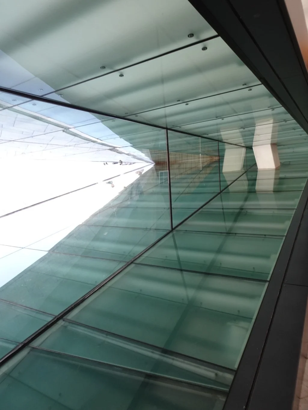 As we waited inside at the designated spot, we noticed the cafes and bars doing a brisk trade, because here inside was also a favourite spot for lunch or dinner. People passed through all the time and we could see figures on the slope beyond the glass walls, climbing up to the wiewpoint on the top. We’d read signs warning of the steep and slipperly surface. “Climb at your own risk” they advised.