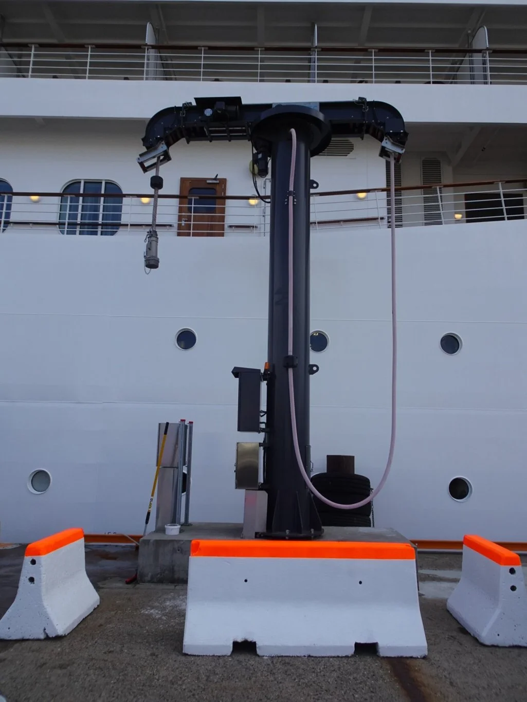 As we set off on our explorations this morning, there was the usual activity alongside the ship. Goods were being loaded, a load of recycling was being taken away and a hose was artfully arranged in small holders to reduce the trip hazard. There was one feature that had us both baffled however and as we stood puzzling what it could be, one of the security team explained.
