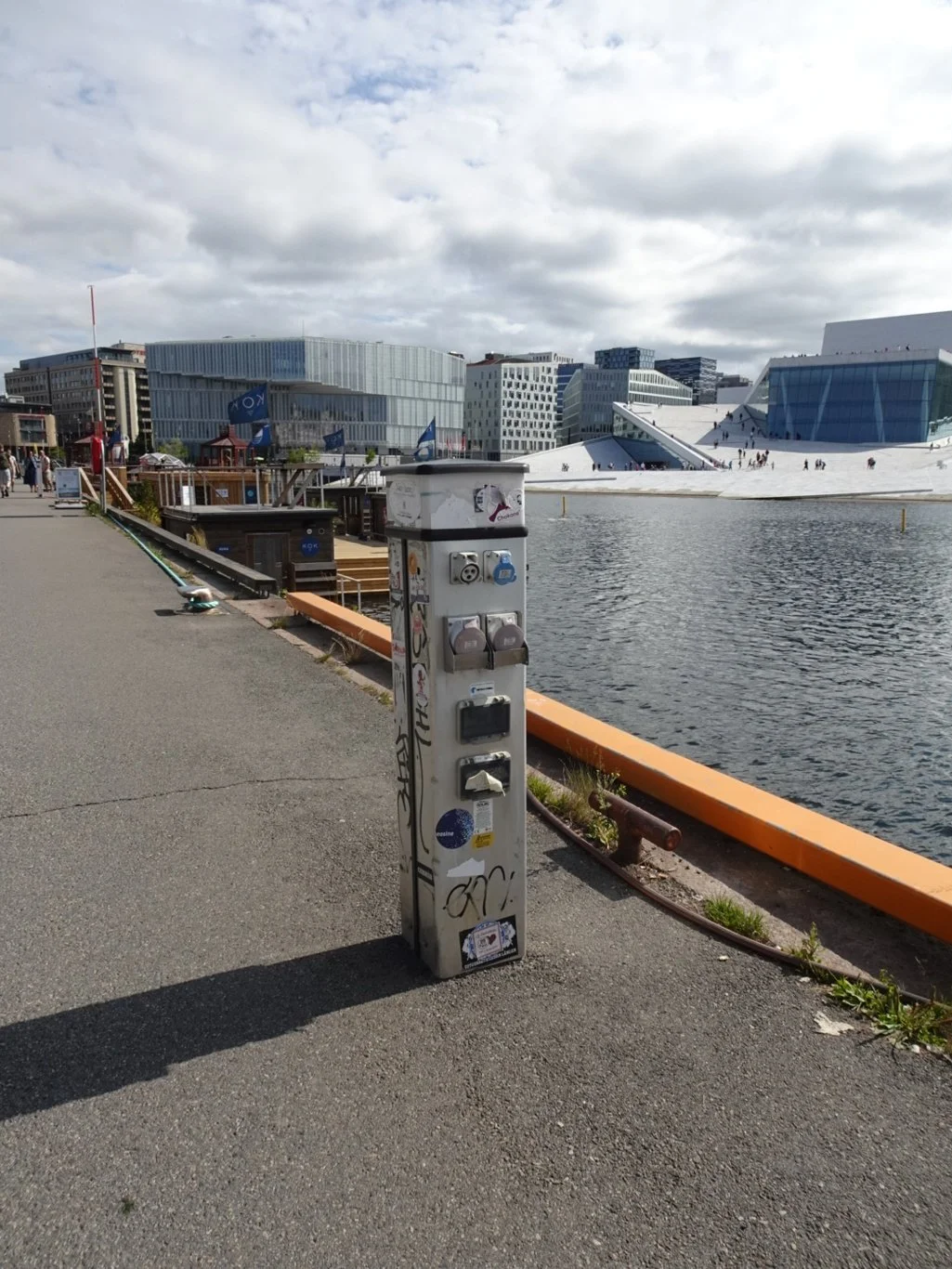 We’d read in the paper this morning that the UK is ten years behind on all of this and can only admire the Norwegians’ commitment. As we walked along the quayside, every two or three metres was a charging point. Not just a single place to plug in a vehicle, but a huge assortment of sockets suitable for charging everything from a boat or a bicycle to a phone. Impressive.