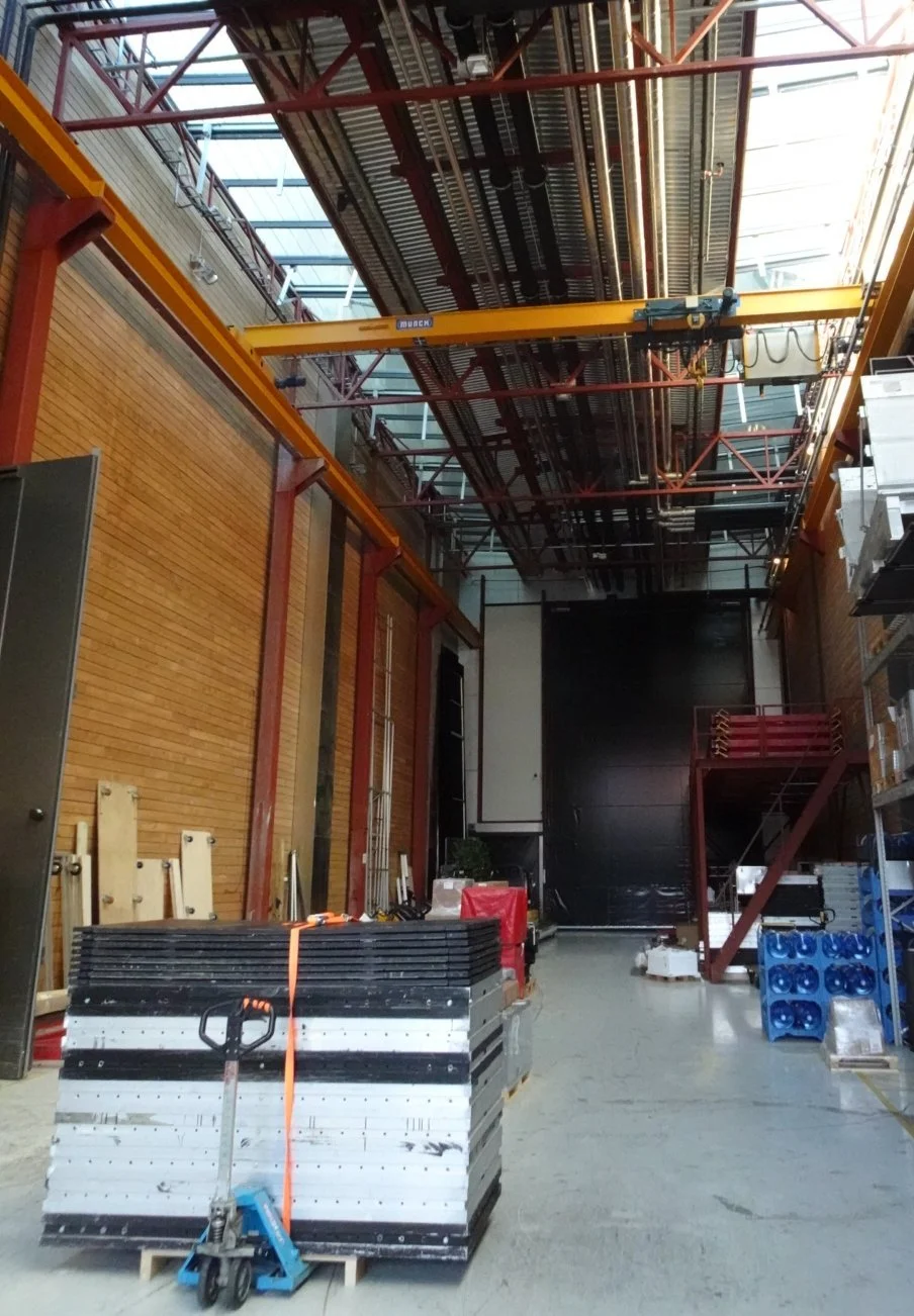 That impression was further enhanced as we stepped inside the workshops. This one, the metal workshop where sets are built - the designs were all on the wall alongside - and huge gantries overhead were available for moving the finished frameworks. Katherina explained the sightline in the theatre was 9m high, so constructions here were pretty big.