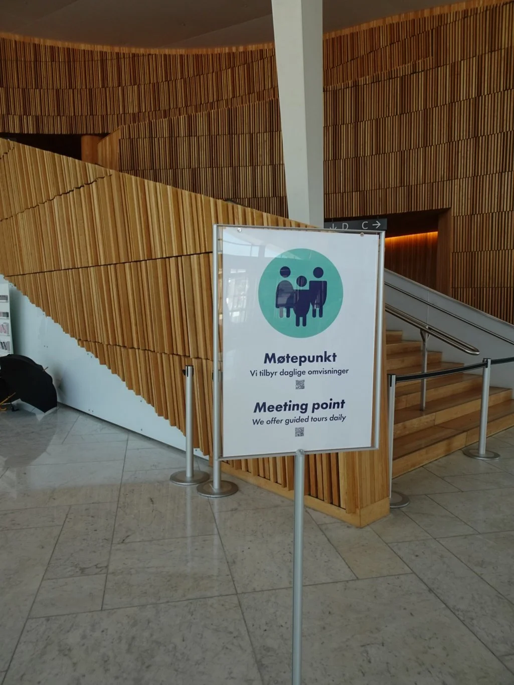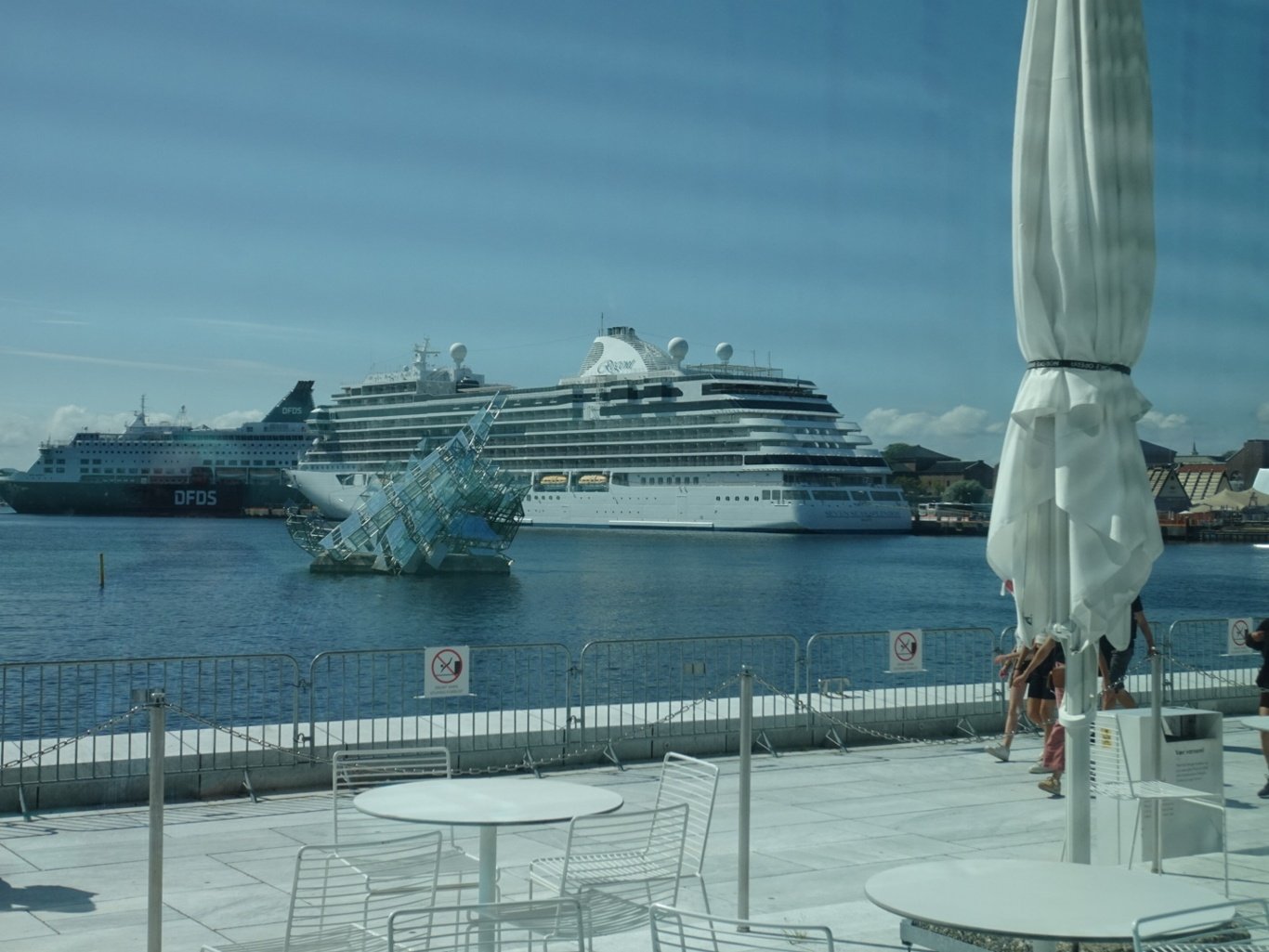 We were not planning to climb at all but joined Katherina’s group and set off through the locked doors to get an inside view of the Opera/Ballet theatre. Firstly, down the corridor towards the dressing rooms from where we had a great view of the harbour and of home! Katherina explained that there had been an international competition for architects, the winner being a Norwegian entry with the concept based on a Norwegian mountain landscape. This whole building was intended to be as open as possible and all the ground floor workshops had large windows open to the street, enabling passers by to see what was going on. Interesting! (I’d have my nose pressed to the windows all the time!)