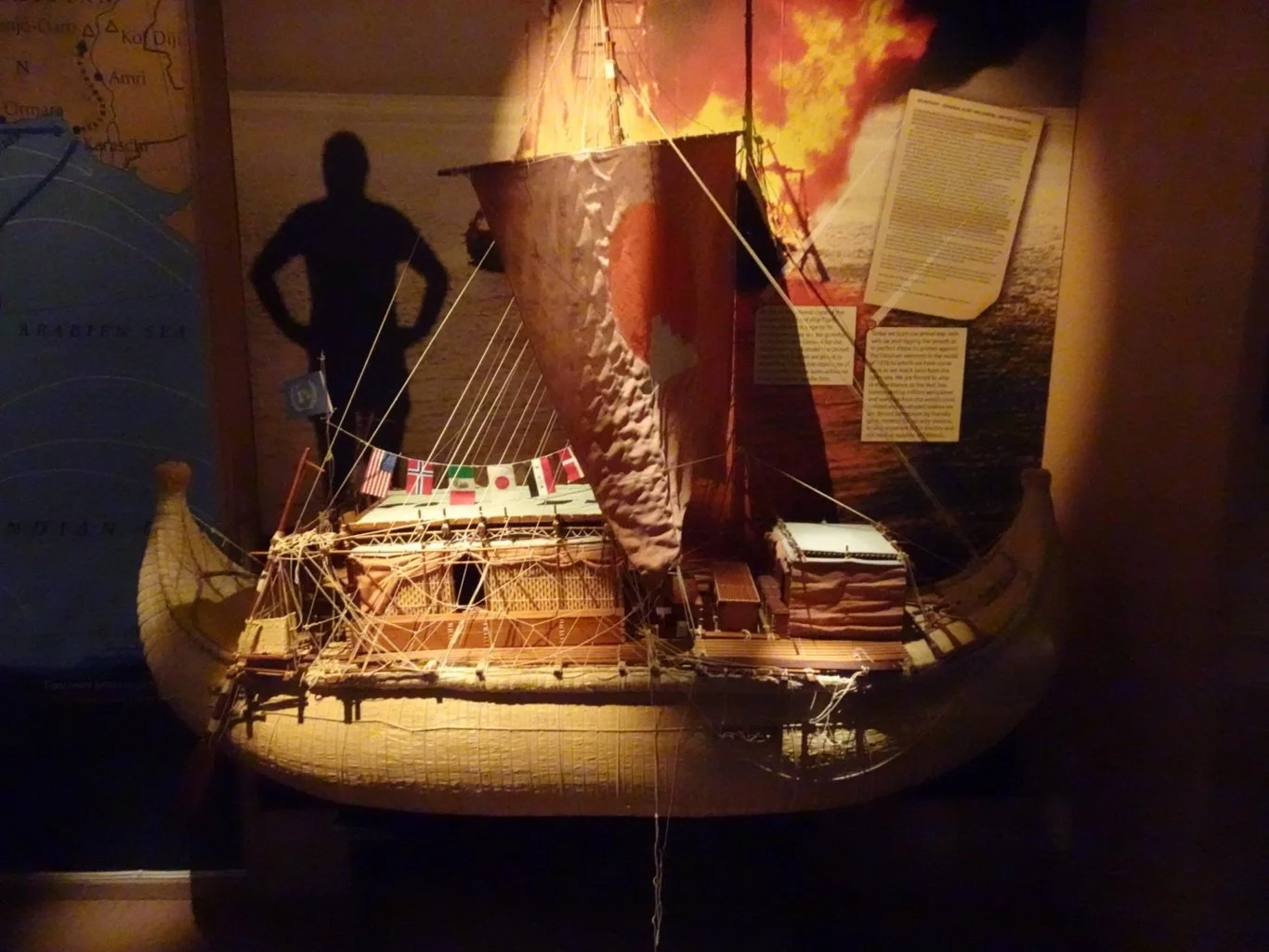 Last but not least was a model of the Tigris. This had been one of Heyerdahl’s final projects and by now he had become pretty disillusioned with the world and the future of mankind. Annie had told us of this, explaining that he had “burned it in disgust”.