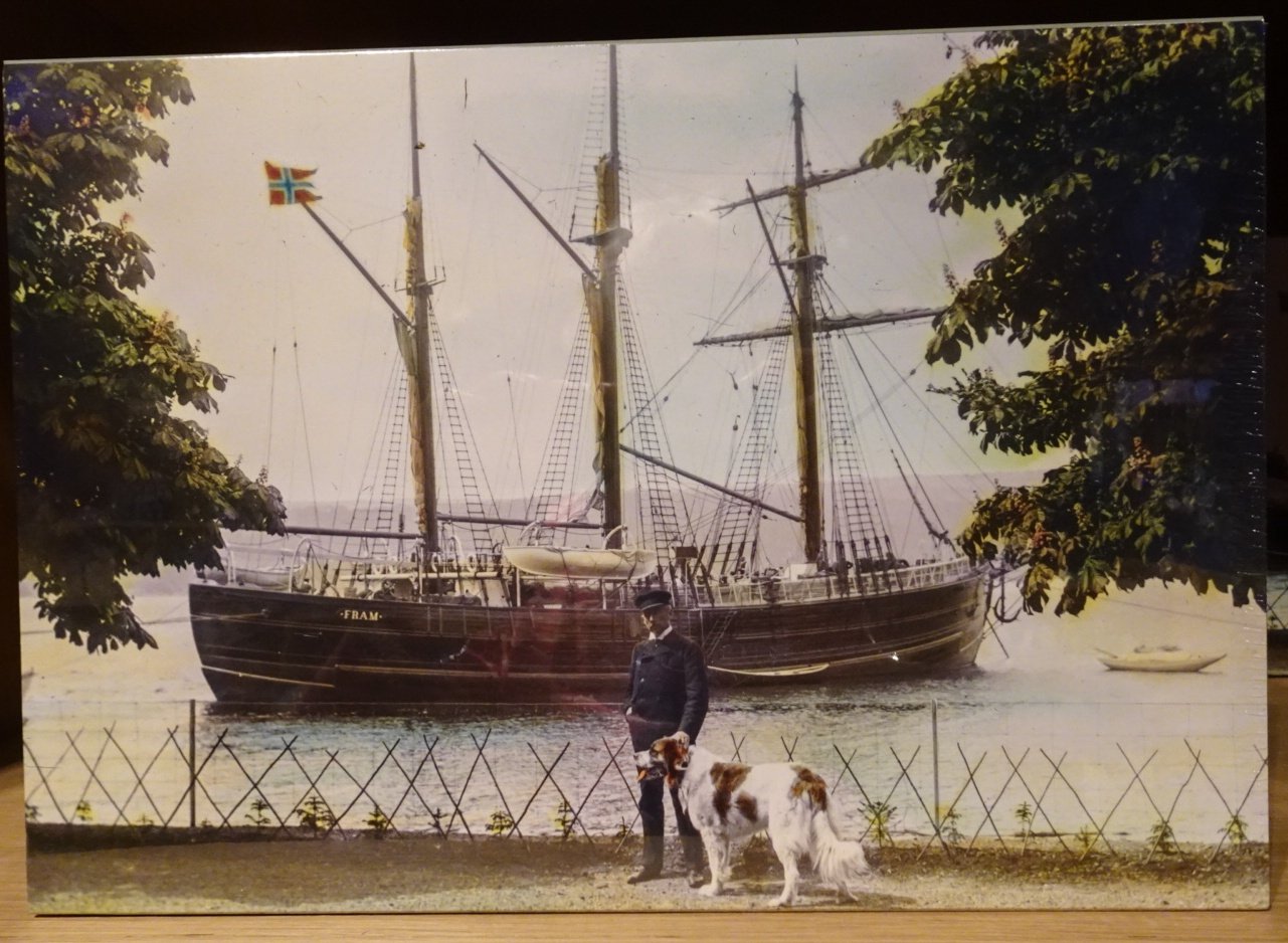 And since I couldn’t get a good mental image of what the Fram looked like as a whole, I quickly snapped one of the postcards in the shop. I think that’s Nansen and his dog there.