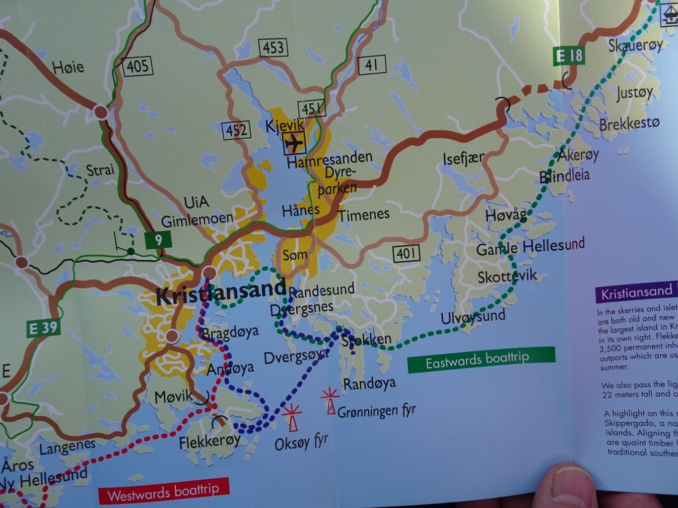 Meanwhile. we were handed a map to show where we were heading. We were sailing the blue route and would disembark the boat at Stokken and transfer to a coach to drive to Lillesand later.