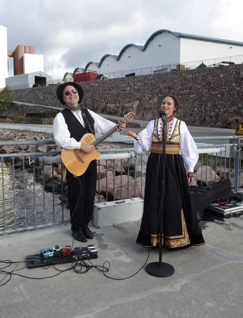 We were greeted in a charming way, firstly by the beautifully dressed lady in the atrium, wearing her lovely bunad and then on the quayside by this similarly well-dressed couple and the sound of Solveig’s Song, which echoed around the harbour.