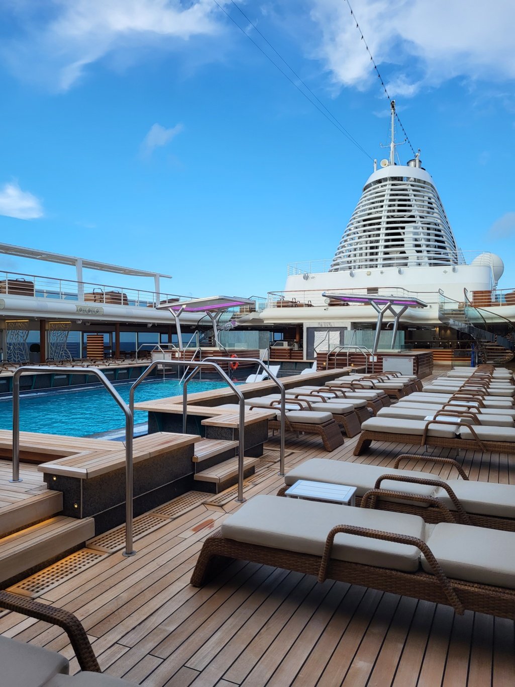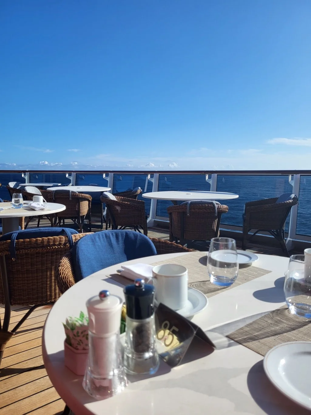 We took the route across the deck afterwards, with time for an aperitif before our restaurant booking. The North Sea skies were still clear and blue in the early evening - quite unbelievable.