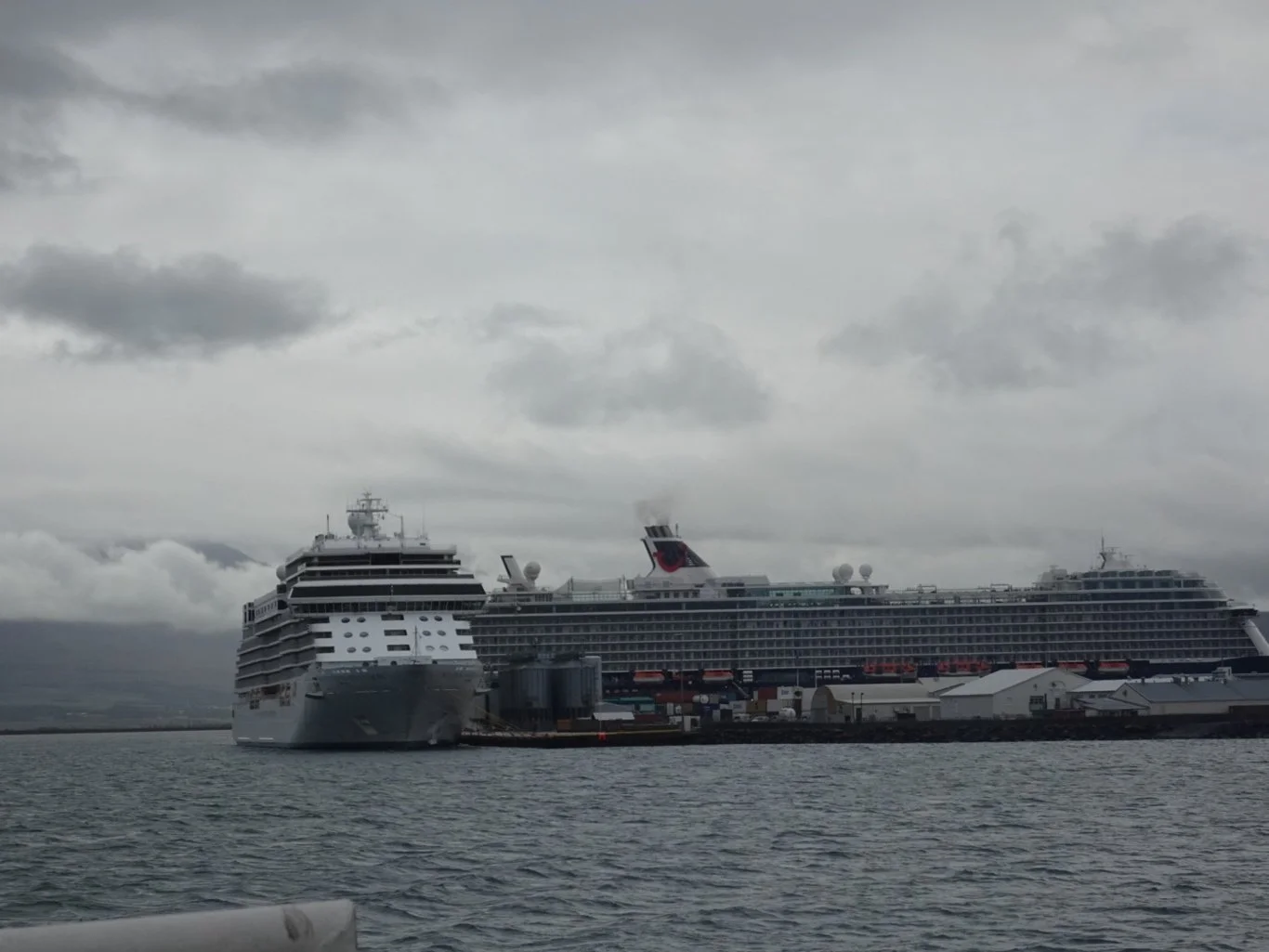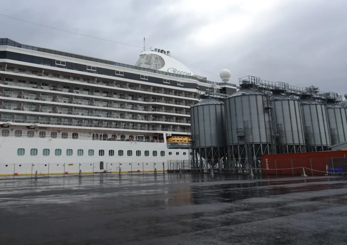 Though we were really pleased to be alongside and not have the bother of tendering ashore, when we saw the weather and the distance we needed to walk to the whale-watching ship, we wondered if tendering wouldn’t have been a better idea!