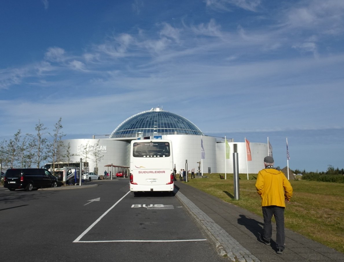We had booked a half day tour of the city en route to the airport, for our flight didn’t leave until late afternoon. For the last time in a while then, we jumped in a coach having checked our luggage was there as well and joined a familiar figure in a yellow oilskin on the drive to Perlan, our first stop.