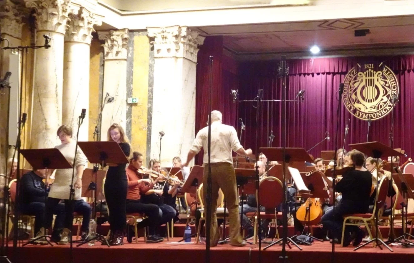 Suddenly there's a stop and a few expletives in an unknown language as someone goes wrong. The disembodied voice offers clarification and direction to return to bar 573. The baton is raised and this time, it flows beautifully. Lara and Julia punch the air with delight.