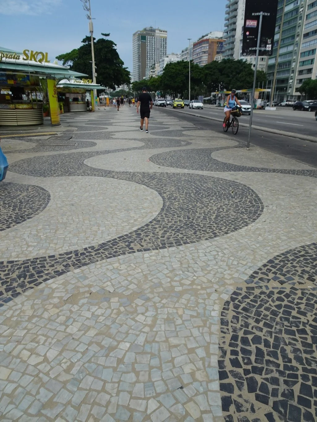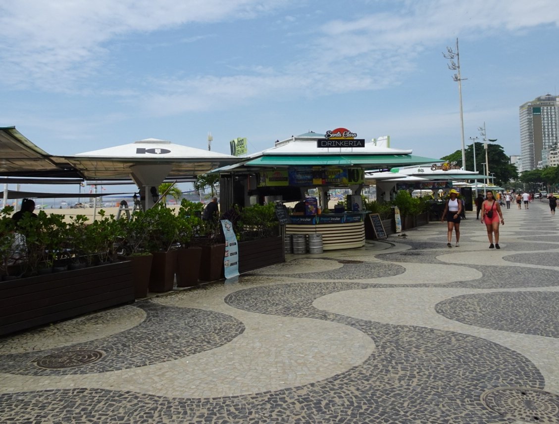 Once safely on what we'd call the Promenade, there's the glorious patterns in black and white stone, well maintained here though less so in the side streets off the beaten track. Between this pathway and the beach are a variety of kiosks - Quiosques - small cafe bars and restaurants of varying quality.