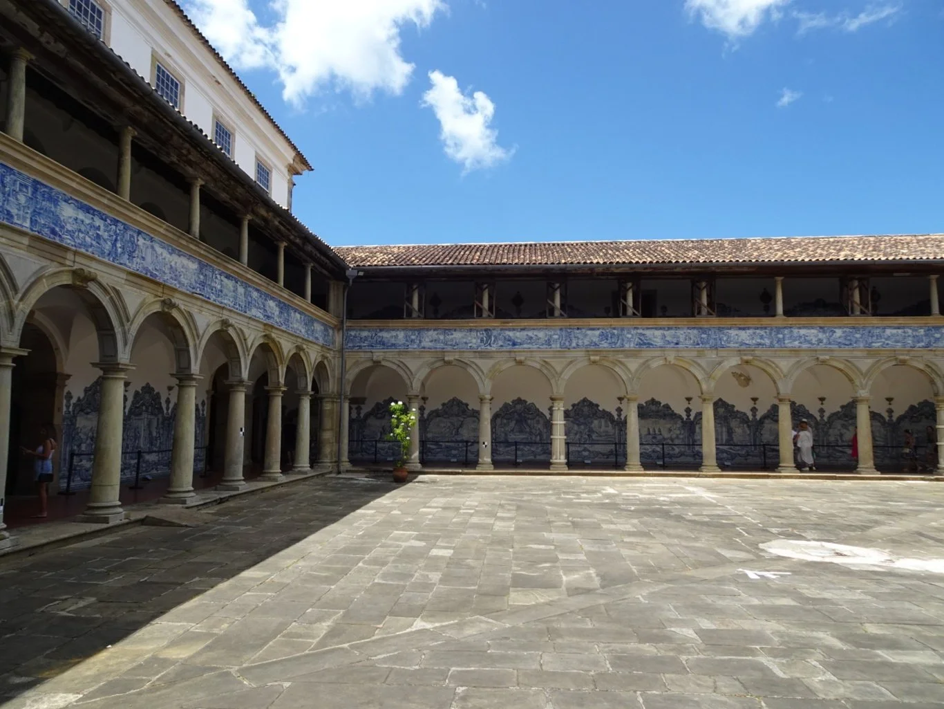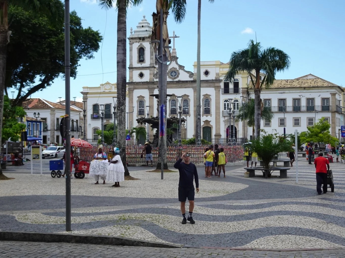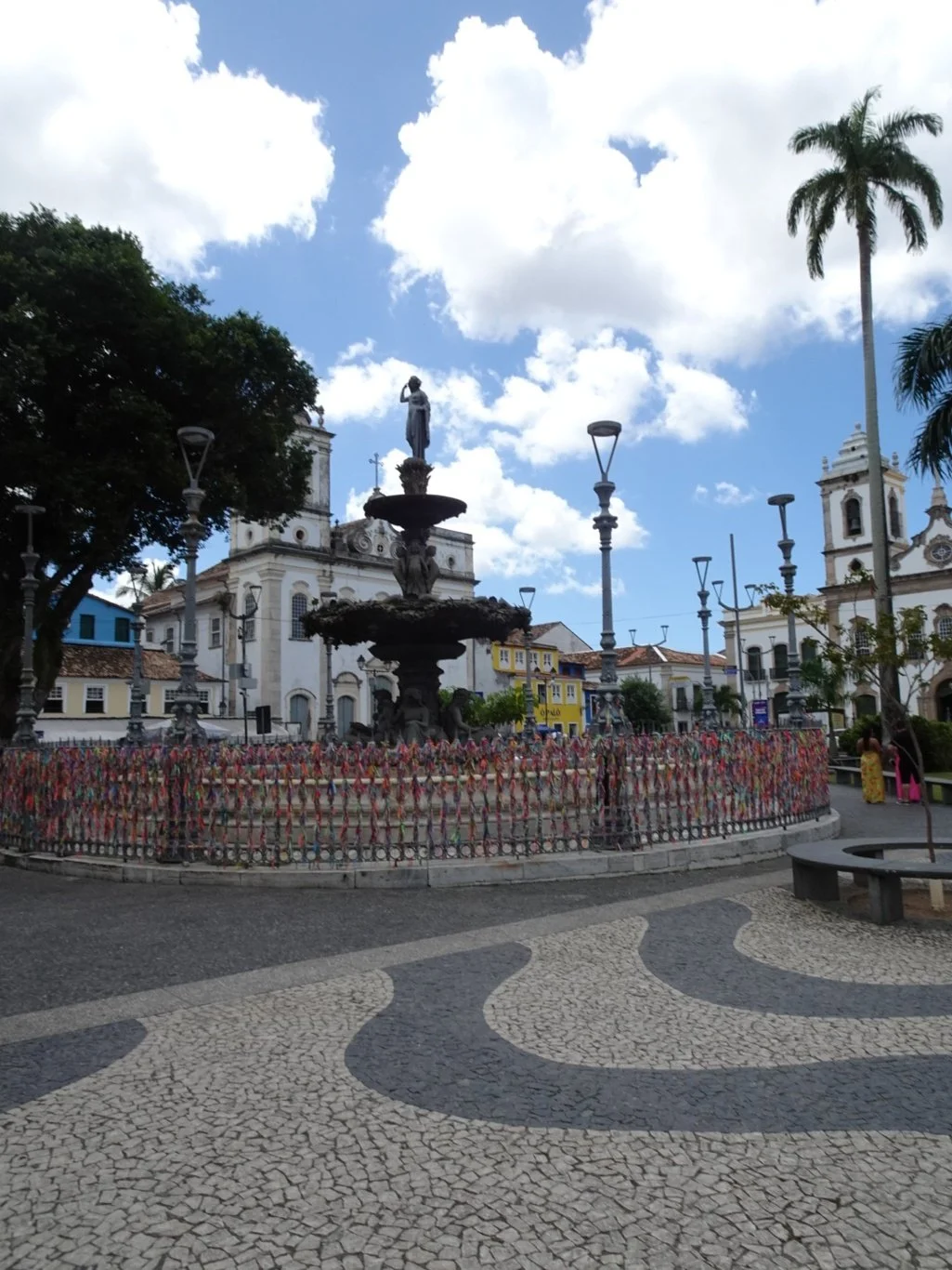 Along a couple of small streets and into a large square, then, with a fountain in the middle. Isaaco pointed out the “Portuguese Stones” there. Here we were in the Terreiro da Jesus and behind us was the Cathedral Basilica our next stop.