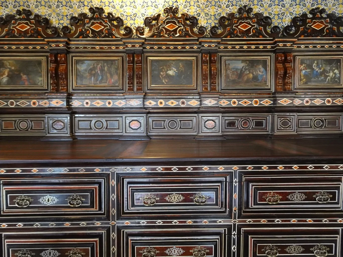 Here was a beautiful set of drawers for vestments and suchlike, each one finely inlaid with ivory and tortoiseshell.