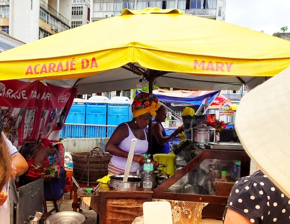 Here, he introduced us to Acaraje Mary, a Baiana de Acarajé who was preparing the ingredients for the local street snack at her stall in the Praça da Sé. These Acaraje deep fried balls of spicy black eyed peas filled with spicy seafood. Right now it was too early to be cooking them, but later, she'd drop them into the frier and according to Isaaco, these were the best in town.