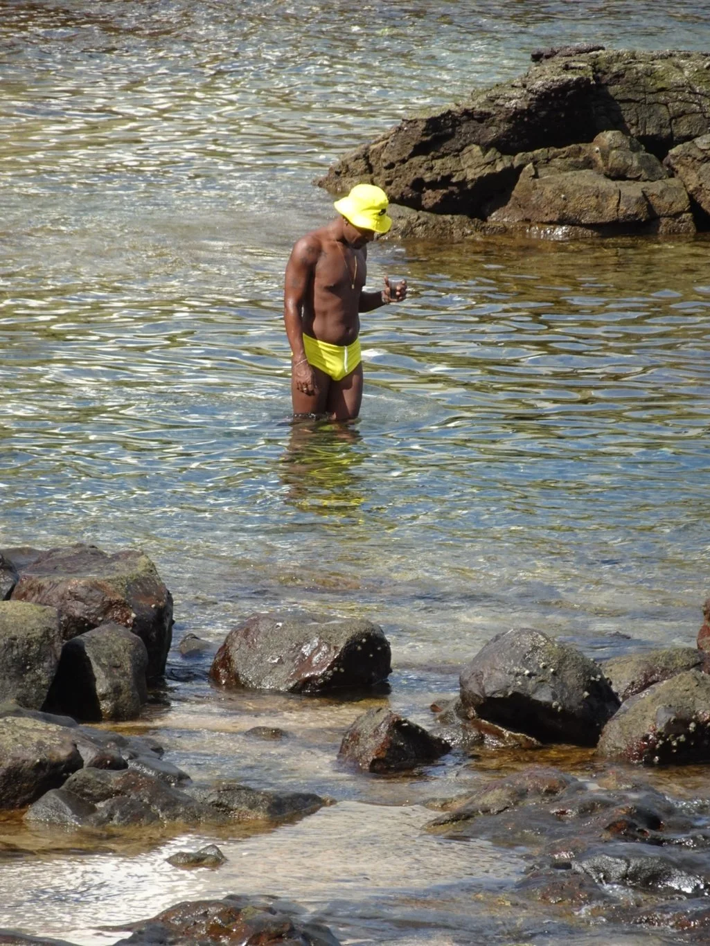 The chap down on the shore looked good in bright yellow - his matching T shirt lay on a nearby rock. I was amused that he appeared to be beachcombing with a glass in his hand! Nearby a couple of dogs frolicked in the water having fun too.