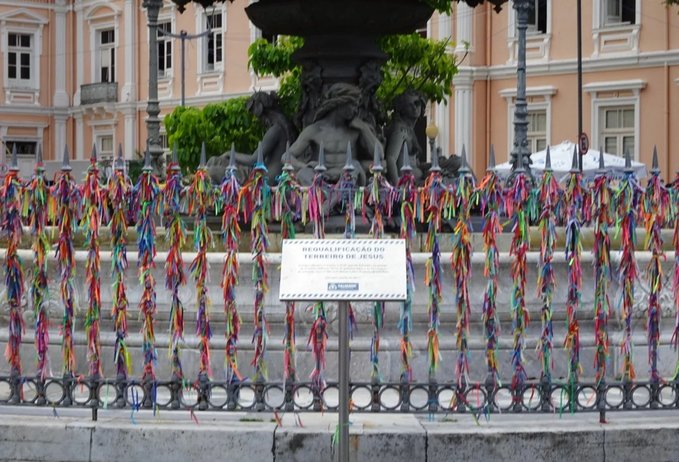The fence surrounding the fountain was covered with coloured ribbon ties.