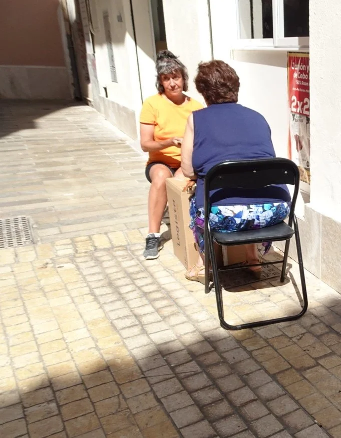 Past women playing cards on an upturned cardboard box…