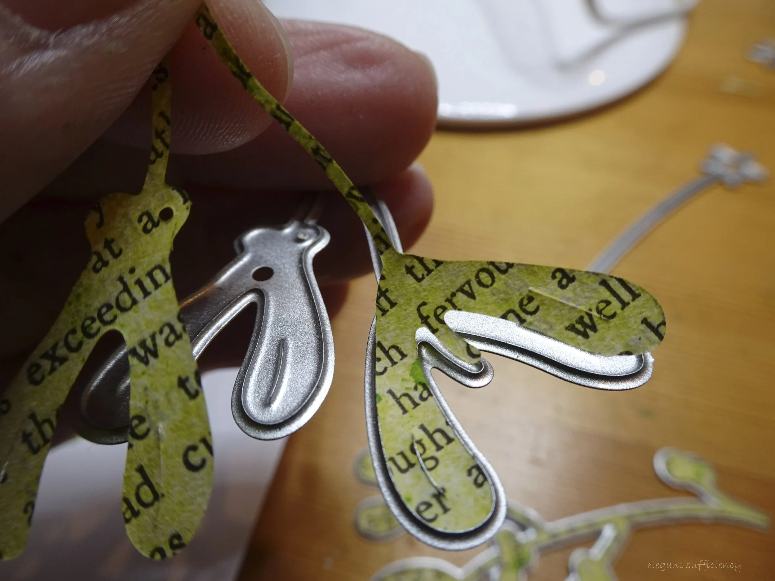 Once dry, I cut the tissue-thin paper using some mistletoe dies, agreeing with my Hero that the print needed to be right way up on the leaves, but trying to get as many leaves from each sheet as I could. I didn’t like the idea of cleaning up another green sink.