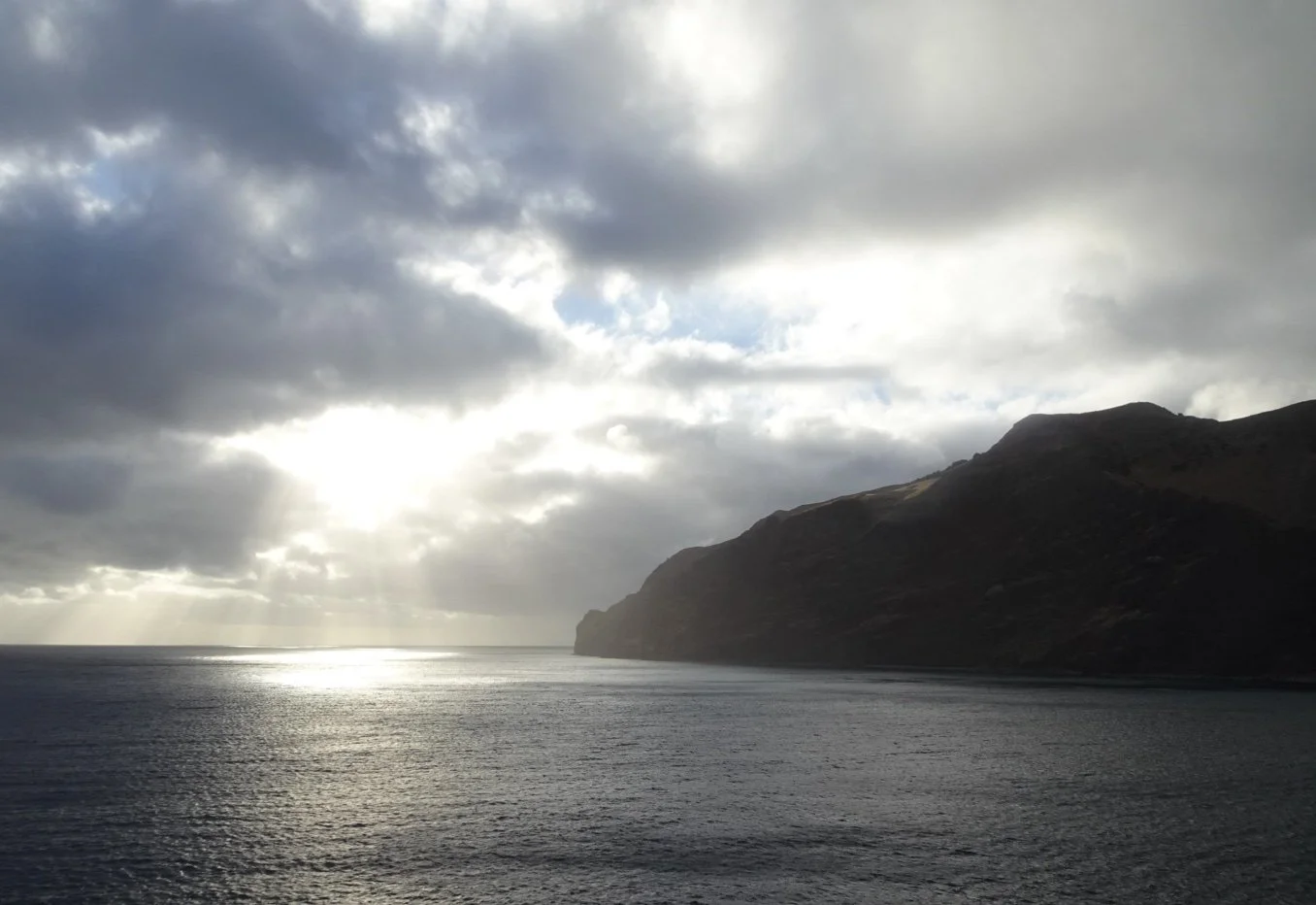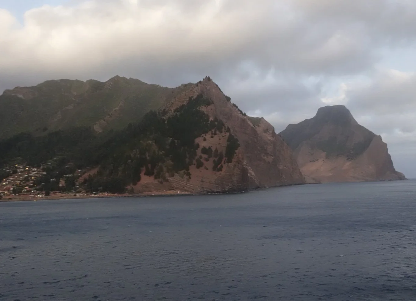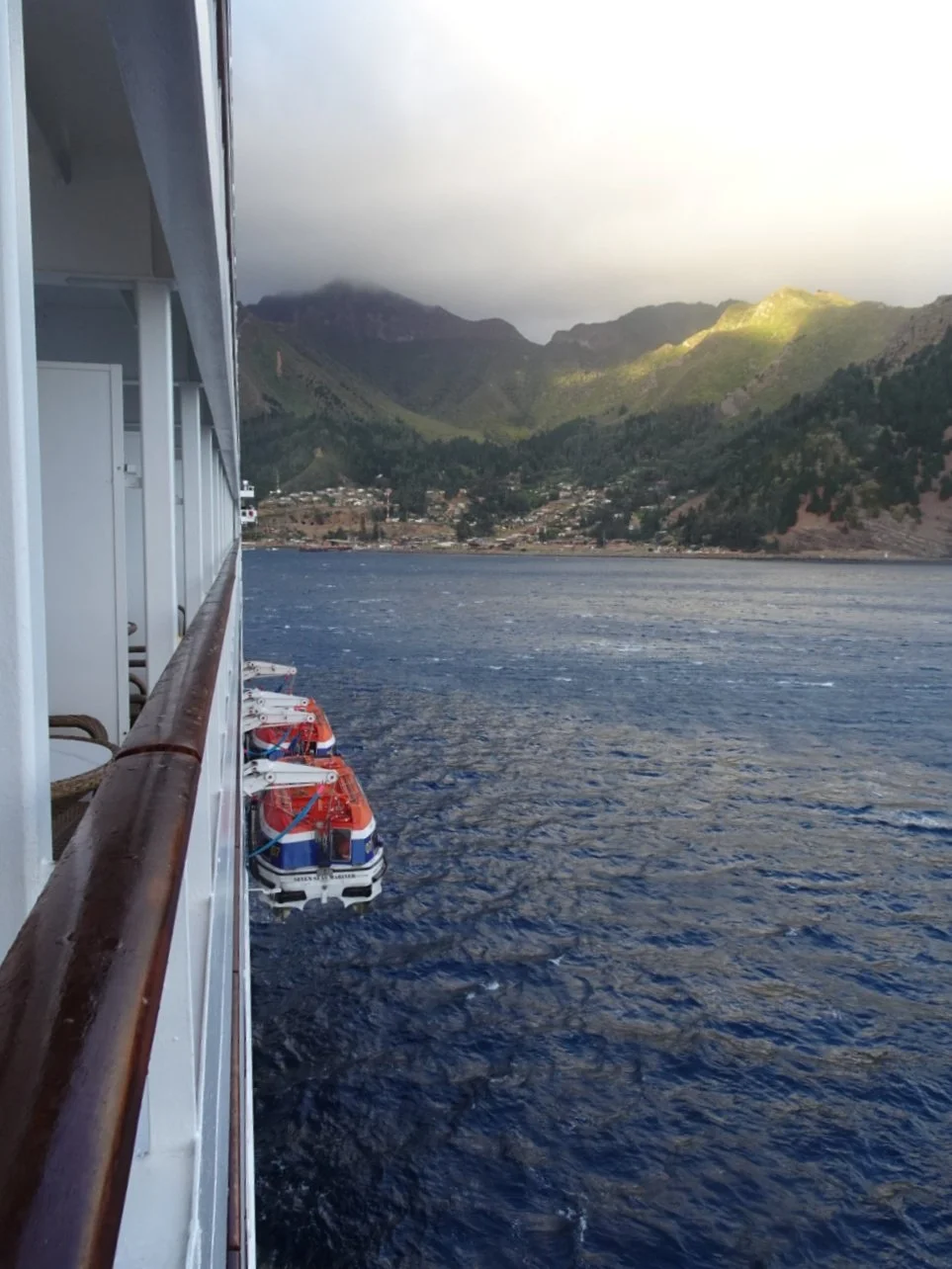 So when we woke and opened the curtains to see the island right there in front of us, we were thrilled, especially to see the ocean looking comparatively calm too. But then came further news: the port was closed and had been since last evening. However, the red light might not be in place much longer, for the weather was improving and the plan was to simply stick around a while at anchor and hope for the best.