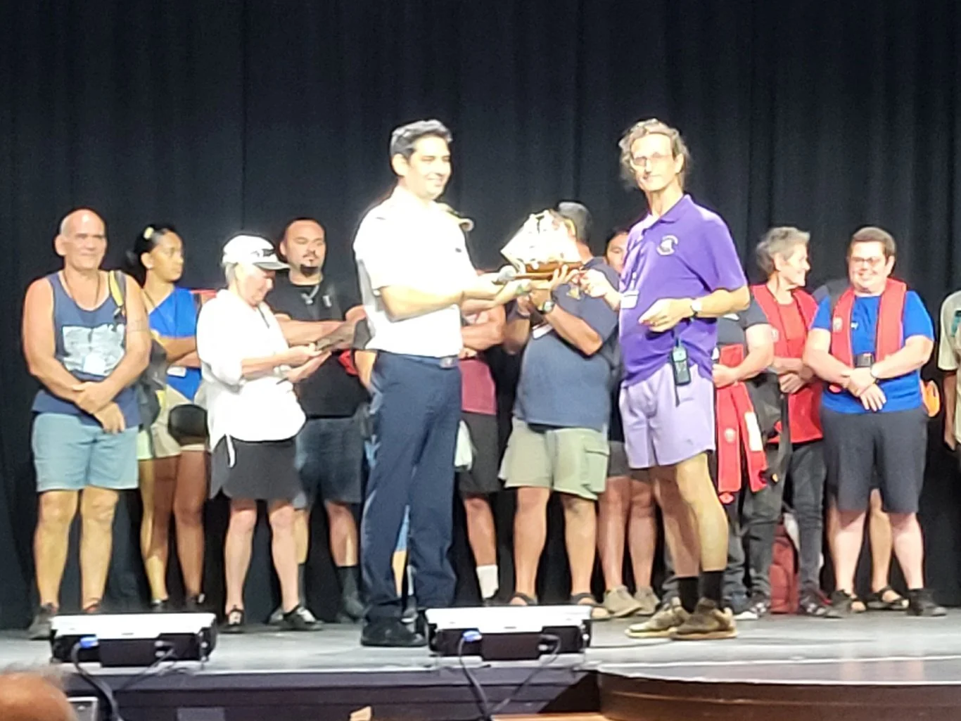 The Mayor or Pitcairn, Simon Young (originally from Pickering, North Yorkshire), thanked Captain Abhi for his determination to pay the island a visit and spoke of the importance the community placed on such comparatively rare events. He presented the Captain with a hand crafted model of the Bounty. Presentation over, the Captain returned to his main task on the bridge whilst the members of the Island community sang two songs to bid everyone farewell.