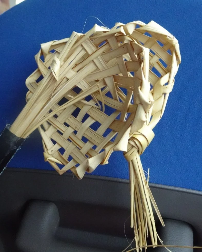 Weaving New Zealand flax. Richard sent round this sample, woven by a friend of his from a phormium leaf in her garden. Since we have some rather troublesome phormiums (phormia?!) in our garden at home, I might give one of them a trim and see what I can weave!