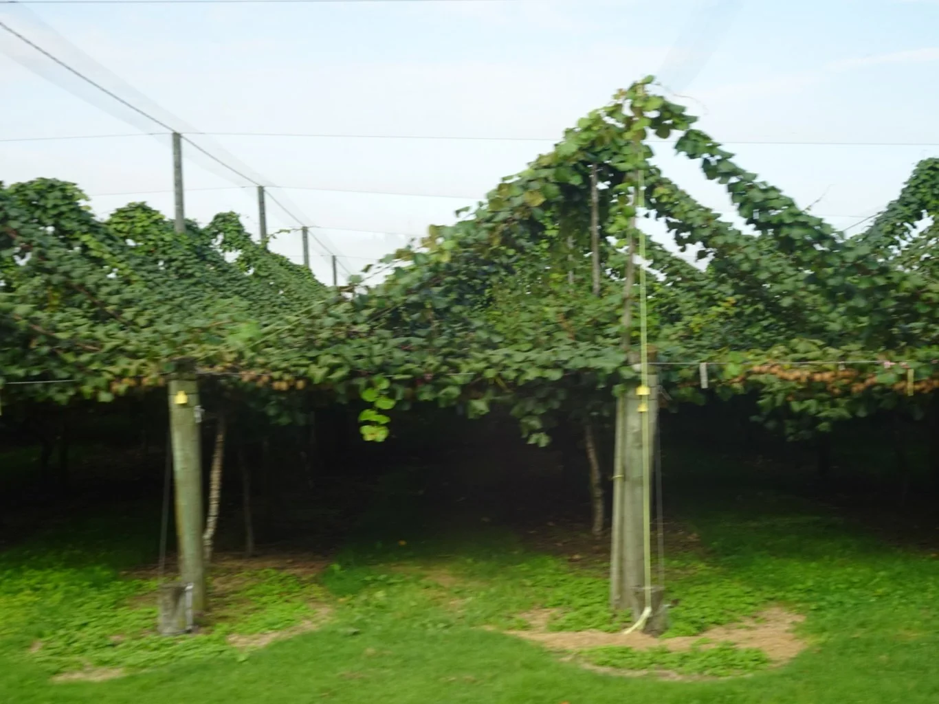 Once the harvest is over, the fruiting vines would be pruned and these upper vines, currently forming a kind of tent structure above them, would be brought down and trained ready for next year's fruiting.