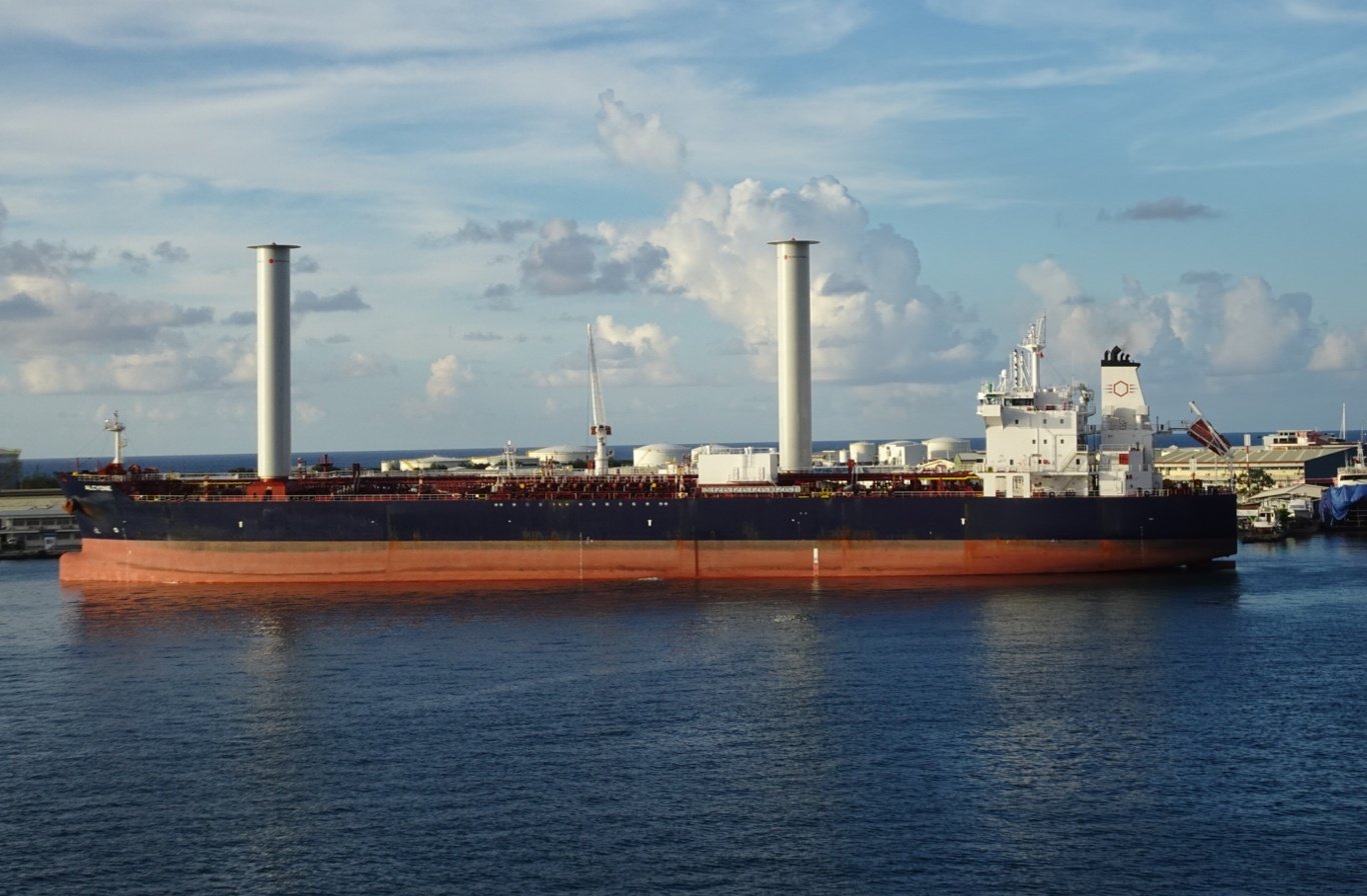 Across the way at the next pier was the strange Alcyone tanker with its two “rotor sails”, a surefire conversation starter over drinks that evening!