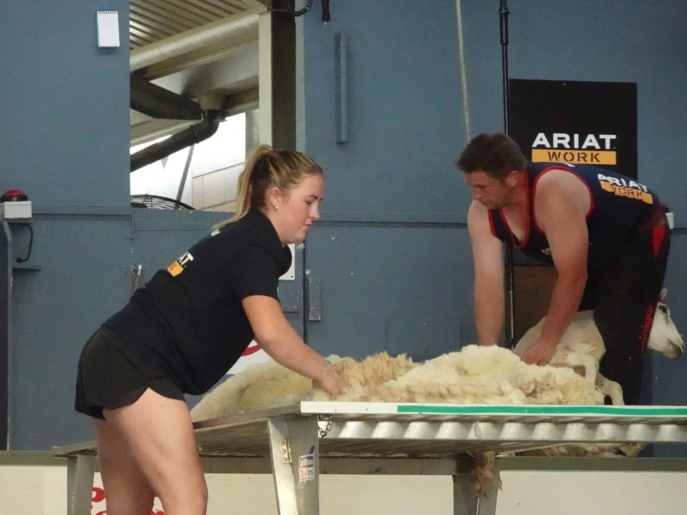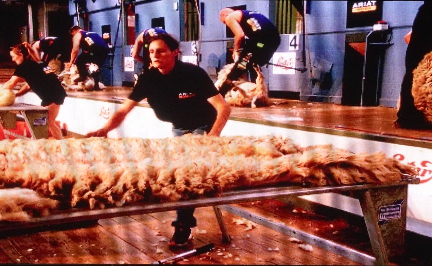 The woolhandlers - mostly young women - work in tandem with the shearers, who work at a phenomenal rate taking only a minute or two to shear a sheep. Out on a sheep farm, they'd soon have a mountain of fleeces to manage, which is why they need a great woolhandler to work alongside them. The woolhandler checks and picks over the fleece, removing any bits of straw and “stuff” that might be attached to the fleece before rolling it tightly into a neat roll, gathering all the loose bits of wool to tuck in securely. It has to be done fast - at the same rate as the shearer works - and it's clearly quite a physical job.