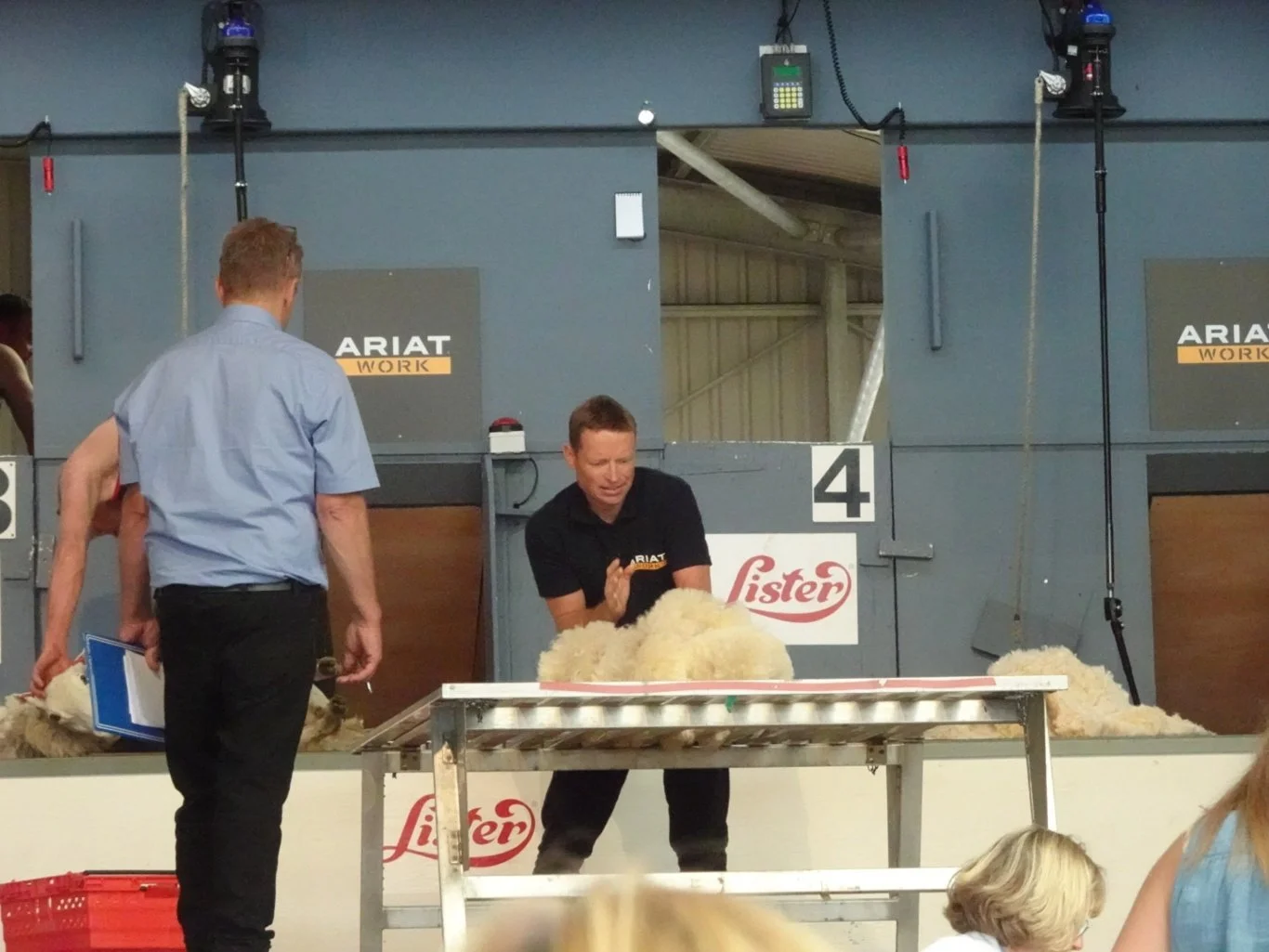 Once the first shearer was three quarters through the first fleece, the second one began, making sure the woolhandler never had to wait for a fleece to work on. Between the three of them, it took little more than five or six minutes to have five neatly rolled fleeces to be presented for checking, together with a clean and tidy workspace. Not only were the handlers to present those five fleeces, they were also expected to clean up, leaving not “a single whisper of wool behind” as the commentator explained.